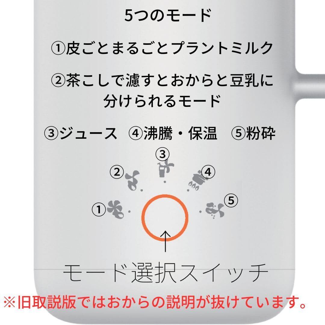 100%ピュアなプラントミルクをご自宅で!5つのモードを搭載/ ①プラントミルク(豆乳、オーツミルク、ナッツミルク、離乳食、ペースト)②おからモード(皮と分けたい場合に)③ジュースモード(ジュース、スムージー、RAWナッツミルク)④温めなおし・保温モード ⑤粉砕モード(粉末だし、米粉)
