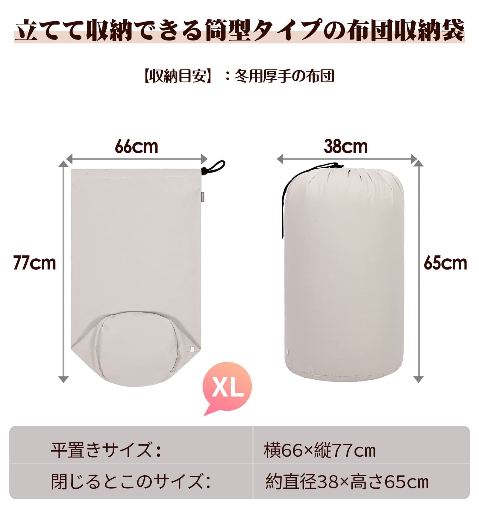 【布団 袋の商品仕様】XLサイズ/ 平置き約: 横66.5× 縦77cm 閉じるとこのサイズ(布団収納時):約直径38×高さ65cm 内容/2枚、収納目安(1枚あたり): 羽毛布団、冬用厚手の布団。 カラー/ホワイト、ブラウン 材質/100% ポリエステル生地