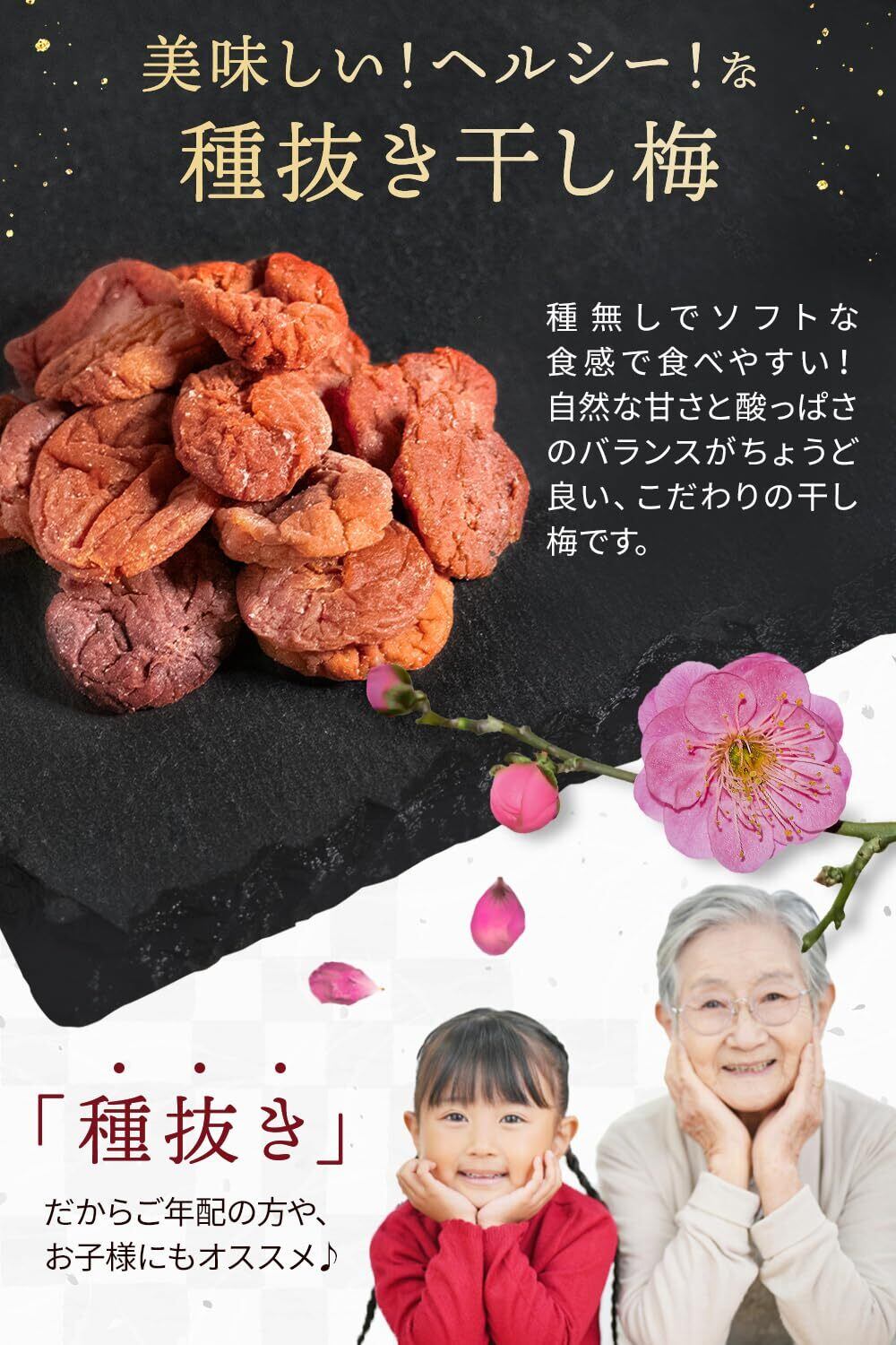 【厳選された種抜き干し梅100%】種無しでソフトな食感で食べやすい!自然な甘さと酸っぱさのバランスがちょうど良い、こだわりの干し梅です。