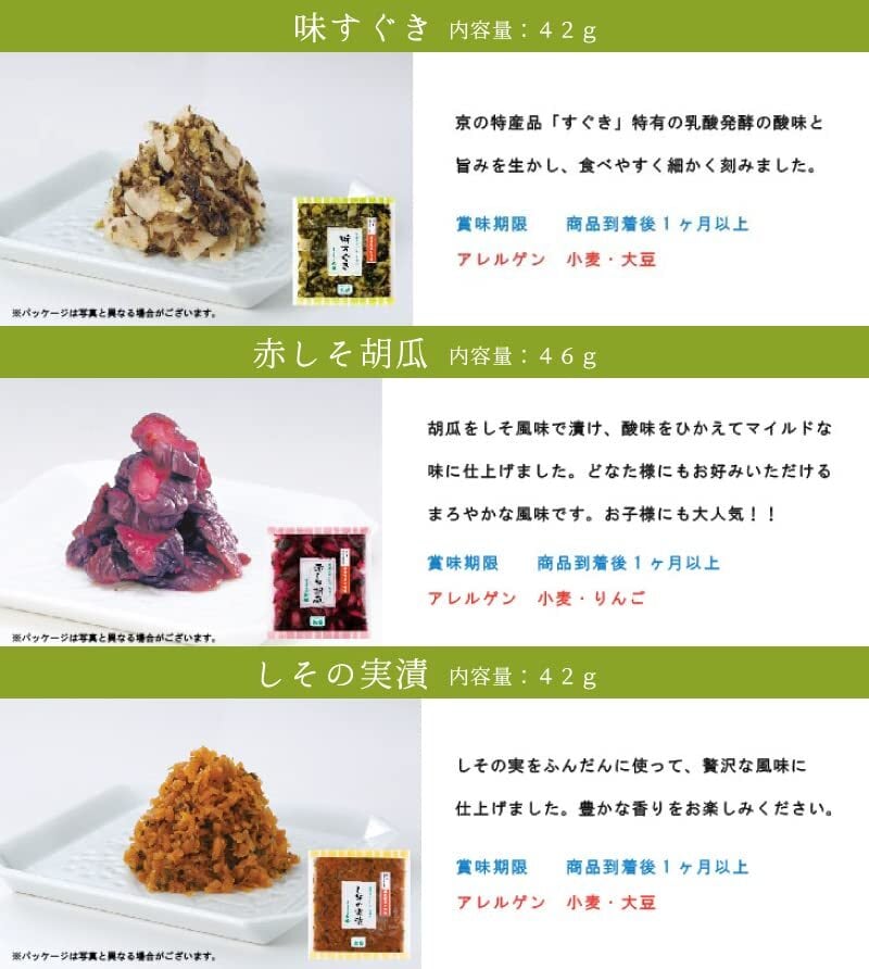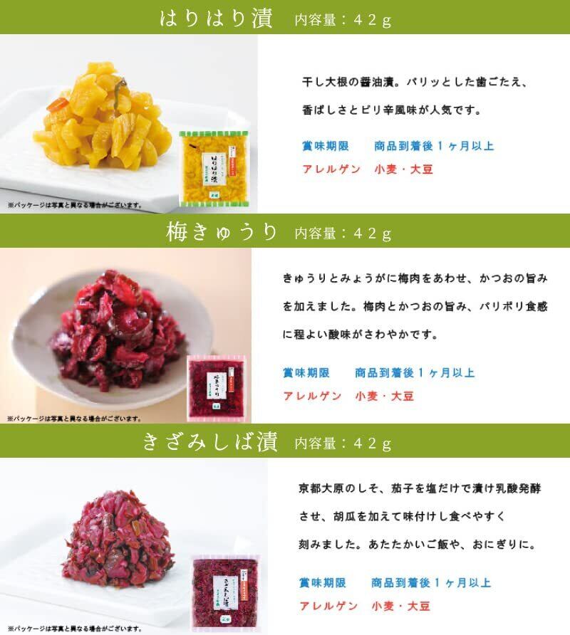 味すぐき 42g×1:きざみしば漬 42g×1:赤しそ胡瓜 46g×1:青しそ胡瓜 46g×1:しその実漬 42g×1:酒の友 42g×1:はりはり漬 42g×1:味しば漬 42g×1:梅きゅうり42g×1:お茶漬胡瓜 42g×1