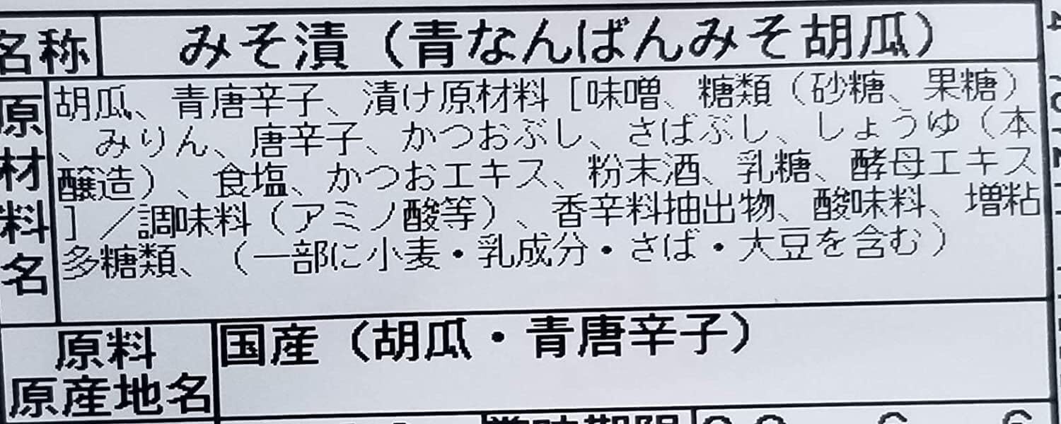 【原材料名】胡瓜、青唐辛子、漬け原材料(味噌、糖類(砂糖、果糖)、みりん、唐辛子、かつおぶし、さばぶし、醤油(本醸造)、食塩、かつおエキス、粉末酒、乳糖、酵母エキス)、調味料(アミノ酸等)、香辛料抽出物、酸味料、増粘、多糖類、(一部に小麦・乳成分・さば・大豆を含む)
