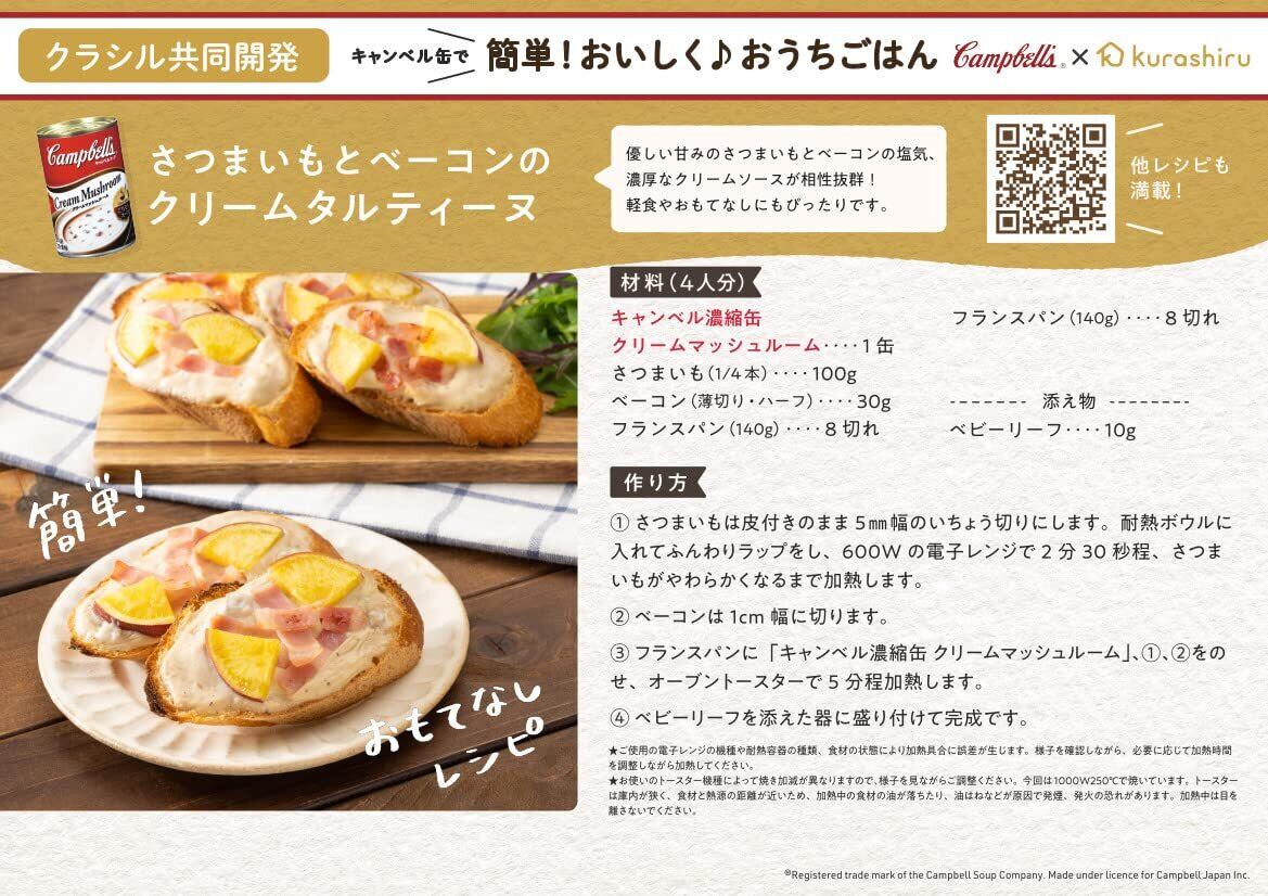 濃縮スープ100g当たり推定値 エネルギー:77kcal、たんぱく質:1.0g、脂質:5.8g、炭水化物:5.2g、食塩相当量:1.3g