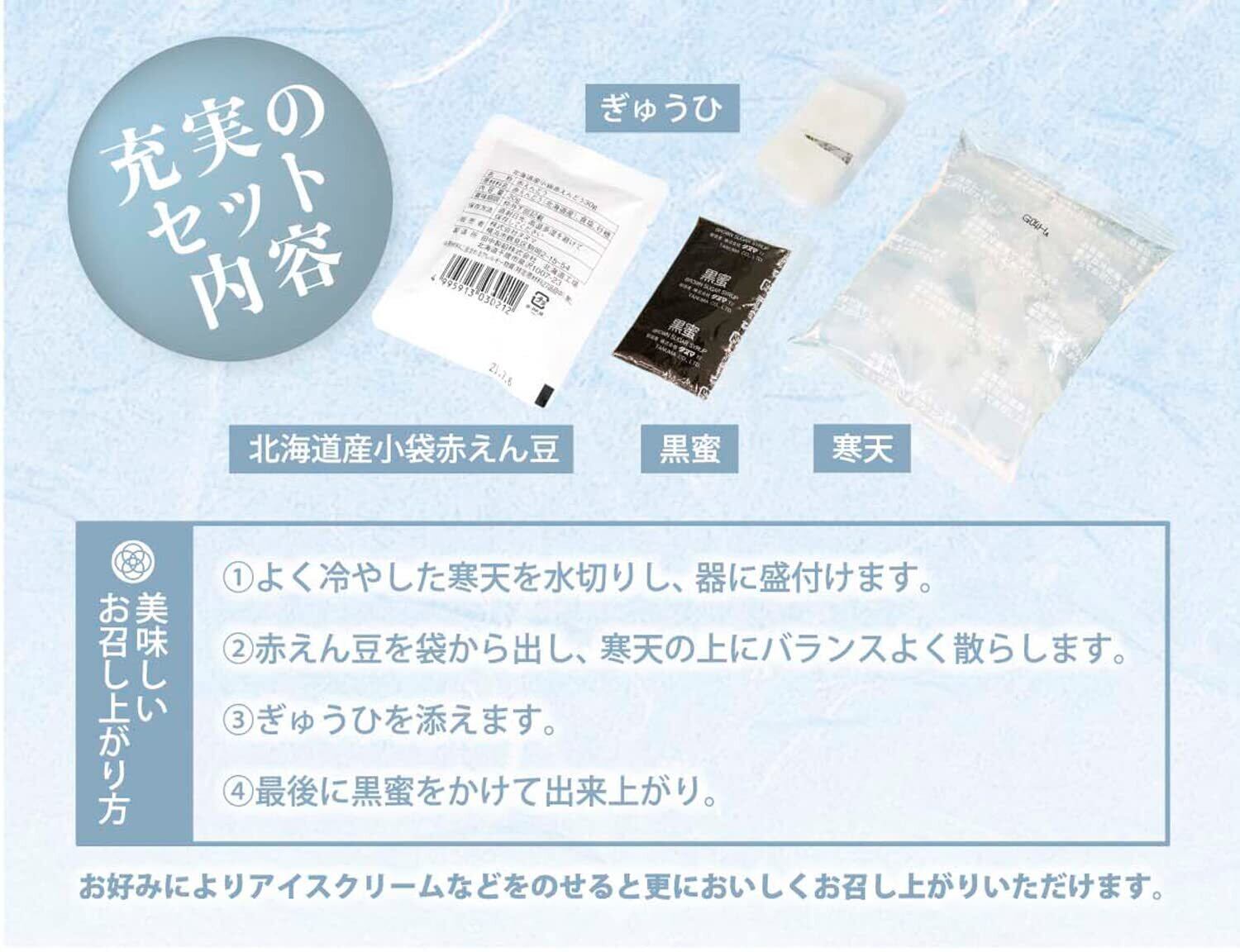 【寒天】寒天(国内製造)、醸造酢、天草(国産)【塩茹で赤えん豆】赤えん豆(北海道産)、食塩、砂糖 【黒蜜】水あめ(国内製造)、黒糖、果糖ぶどう糖液糖、糖みつ【ぎゅうひ】麦芽糖(国内製造)、マルトオリゴ糖、もち米粉、でん粉/トレハロース、加工でん粉、乳化剤、(一部に乳成分を含む)