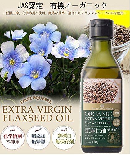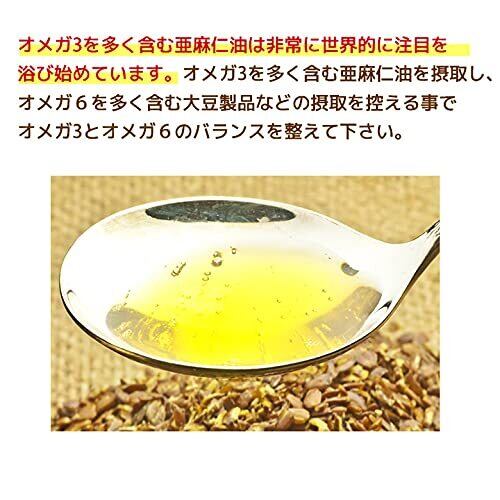 必須脂肪酸のオメガ3(アルファリノレン酸)を約55%~約65%含んでいます。自然の成分ですので沈殿物が生じる事がありますが品質には変わりありません。無添加・無精製・無漂白・保存剤。
