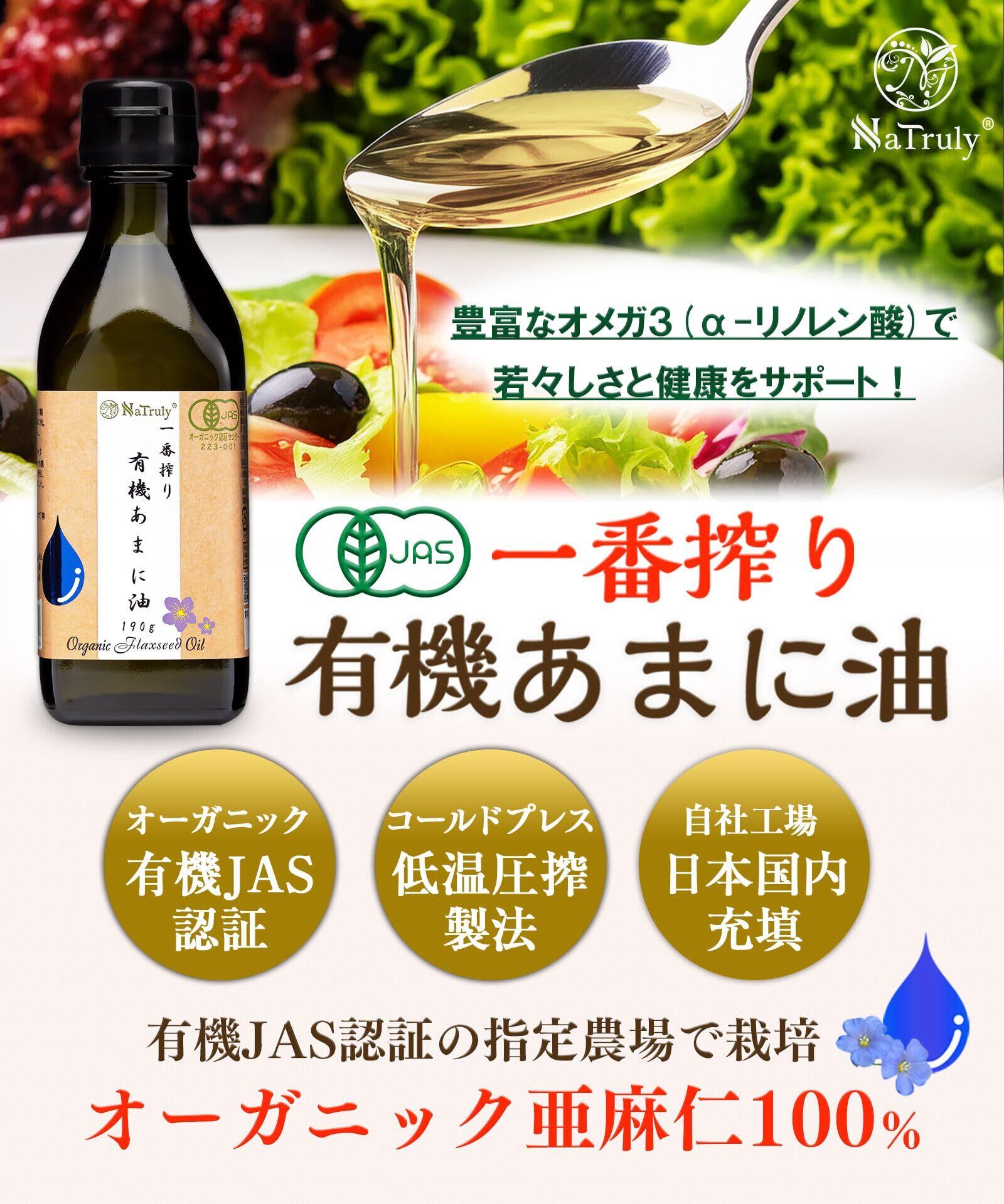 【有機あまに油 3つのこだわり】有機JAS認証 オーガニックあまに100%/コールドプレス製法(低温圧搾製法)で一番搾りのみ使用/日本国内の有機JAS認証取得の自社工場で充填