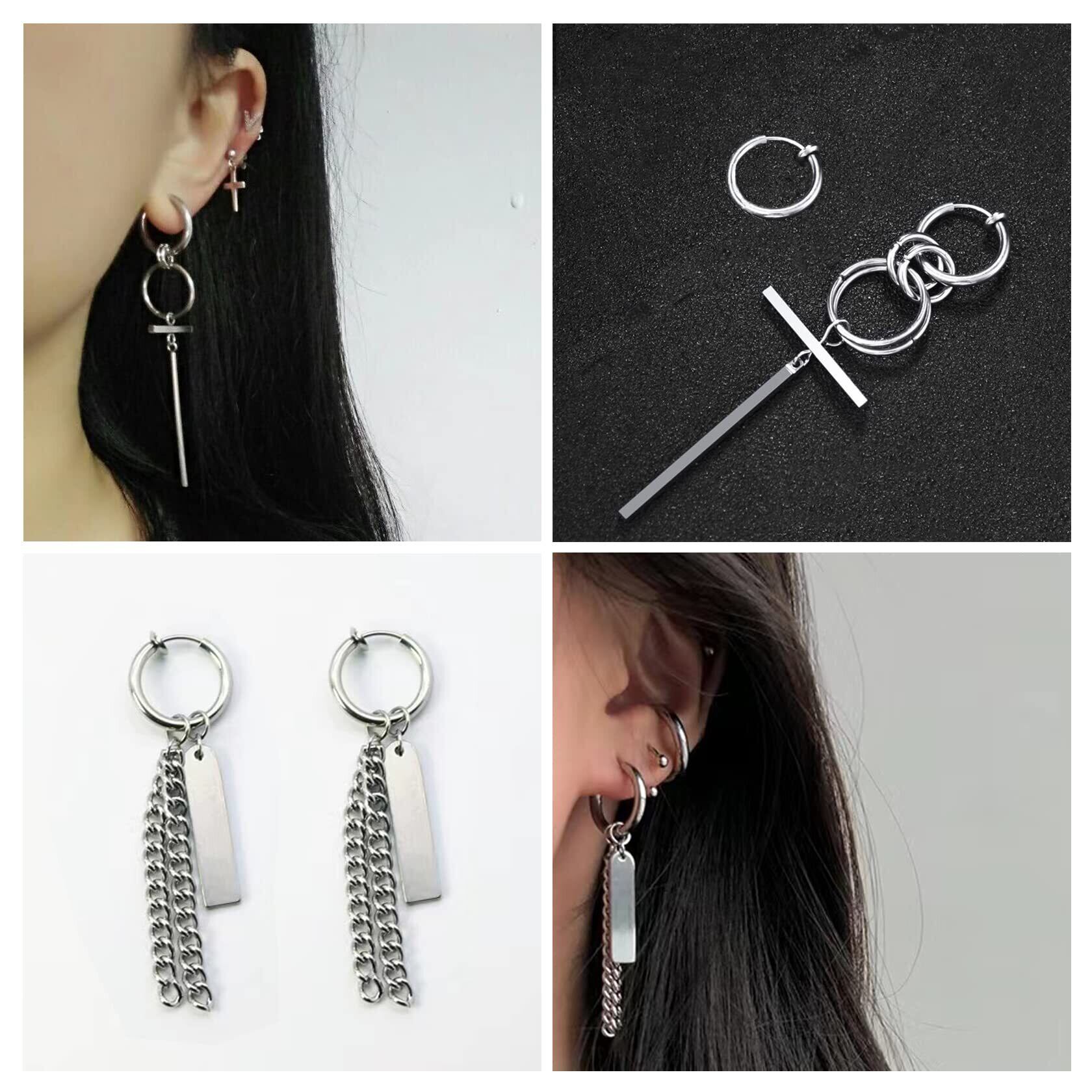 【人気でおしゃれなデザイン】フープタイプにチェーンやスティックなどの流行なパーツが付いた揺れるフェイクピアスです。ピアスのパーツは付けたり、外したりできるし、自由に組み合わせることによって異なるスタイルを楽しめます。 韓国 K-POPアーティスト、韓国アイドル、日本のダンサー、HIPHOP、B系など着用している人気のデザインです。イヤリングをペアでつけたり、片耳だけ付けたり、重ね付けたり、軟骨ピアスとして付けたりして1色々な付け方法があり、通常のフープイヤリングに飽きてしまった方にとてもオススメなアクセサリーです。