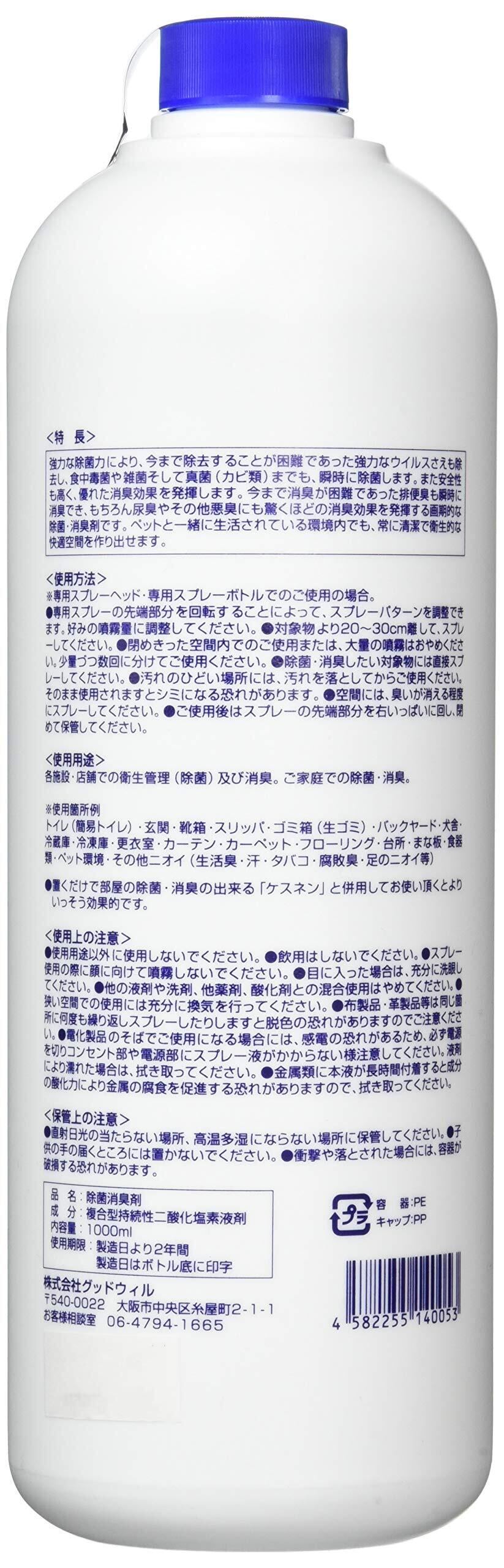 スプレーするだけで強力なウィルスもわずか5秒で除去! ! その強力な除菌力の2次効果として優れた消臭効果を発揮します。お得な1Lの詰替えボトル。