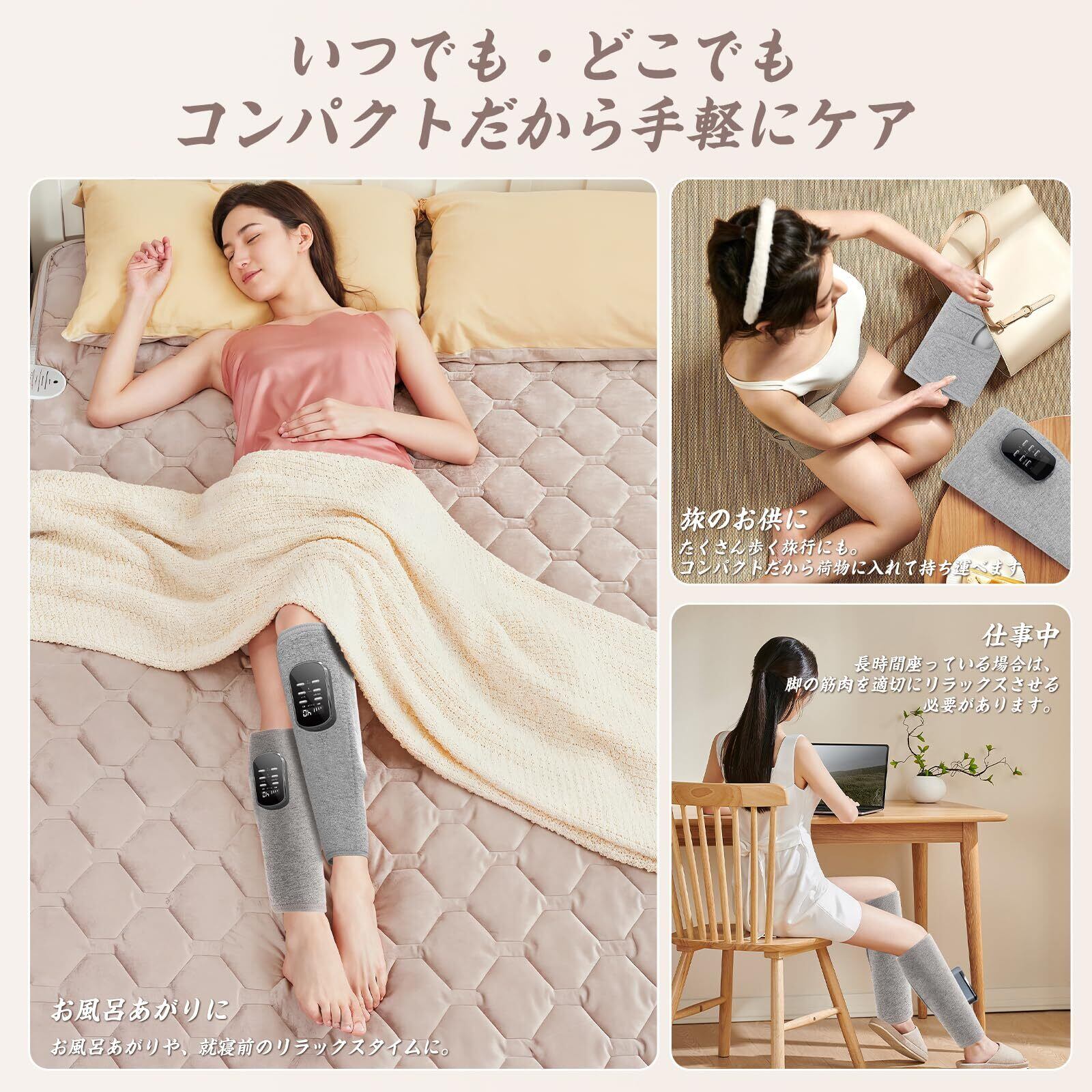【温熱機能】温熱機能を搭載しており、低温(40)、中温(45)、高温(50)の3つの温度を選択することができます足を温めることで気持ちよくケアできるため、スッキリ感を得やすいでしょう歩くことが少ないと、気づかないうちに足が冷えやすくなります在宅ワークなどによって歩くことが減っている人は、本製品がおすすめです自分のニーズに応じて温熱機能をオンオフすることができます15分、20分、25分、30分の自動タイミングを選択できます、使いすぎの心配もなく、寝てしまっても安全の心配がありません。