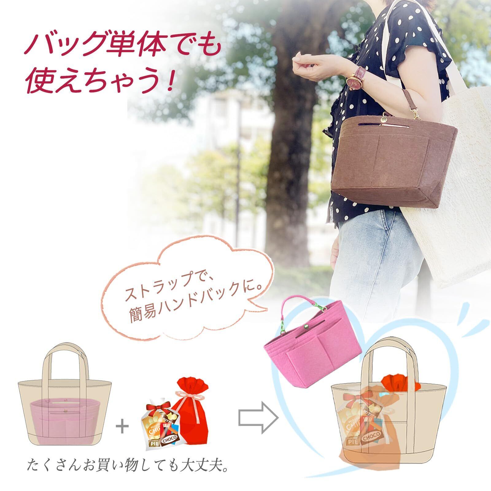 【ストラップ・ボタン付きで移し替えもラクラク】 バッグインバッグ フェルト 軽量タイプ。ショルダーストラップ付きで取り外し可能。鍵やパスケースを付けて便利に使えます。バッグを変えるときも、ストラップを持って中身ごと移動できて時短に。中央にはペットボトル対応のボタン付きで、荷崩れも防止。 収納や整理の専門家監修のもと、日々の使いやすさを重視して仕上げています。 フェルト素材のストラップと柔軟な底板が付属。フェルトストラップの代わりに使える、おしゃれなパールストラップ付きタイプもお選びいただけます。