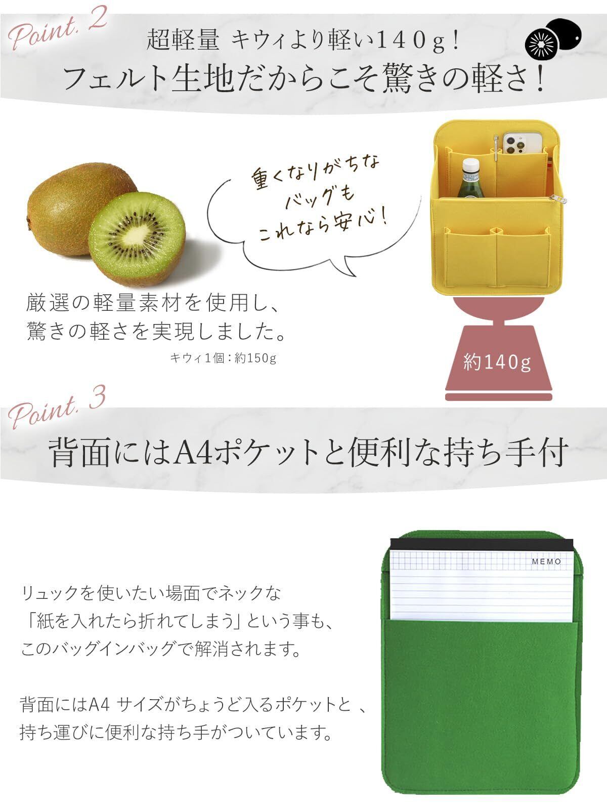 【軽量&多ポケット設計】 140gの軽量設計で、それぞれA4・B5サイズに対応。フェルト素材ならではの柔らかさと軽さで、バッグを選ばず活用できます。