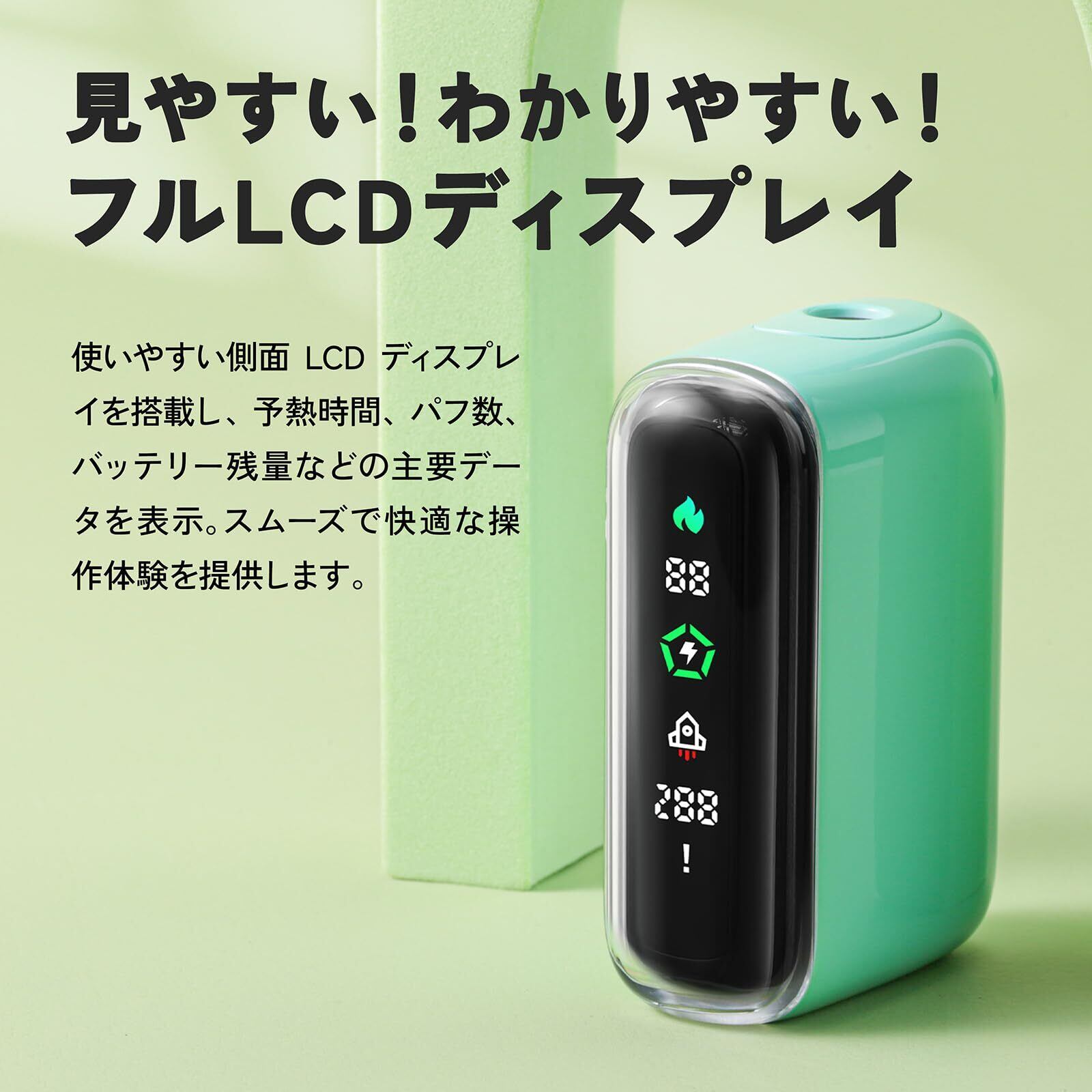 本体はフルスクリーン液晶を搭載しており、バッテリー残量や温度、使用状況を一目で確認できます。これにより、安心しての使用が可能で、快適な喫煙体験を提供します。
