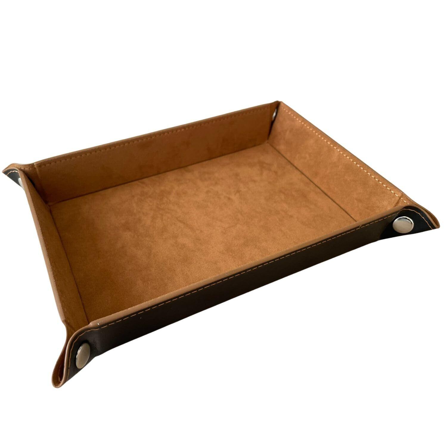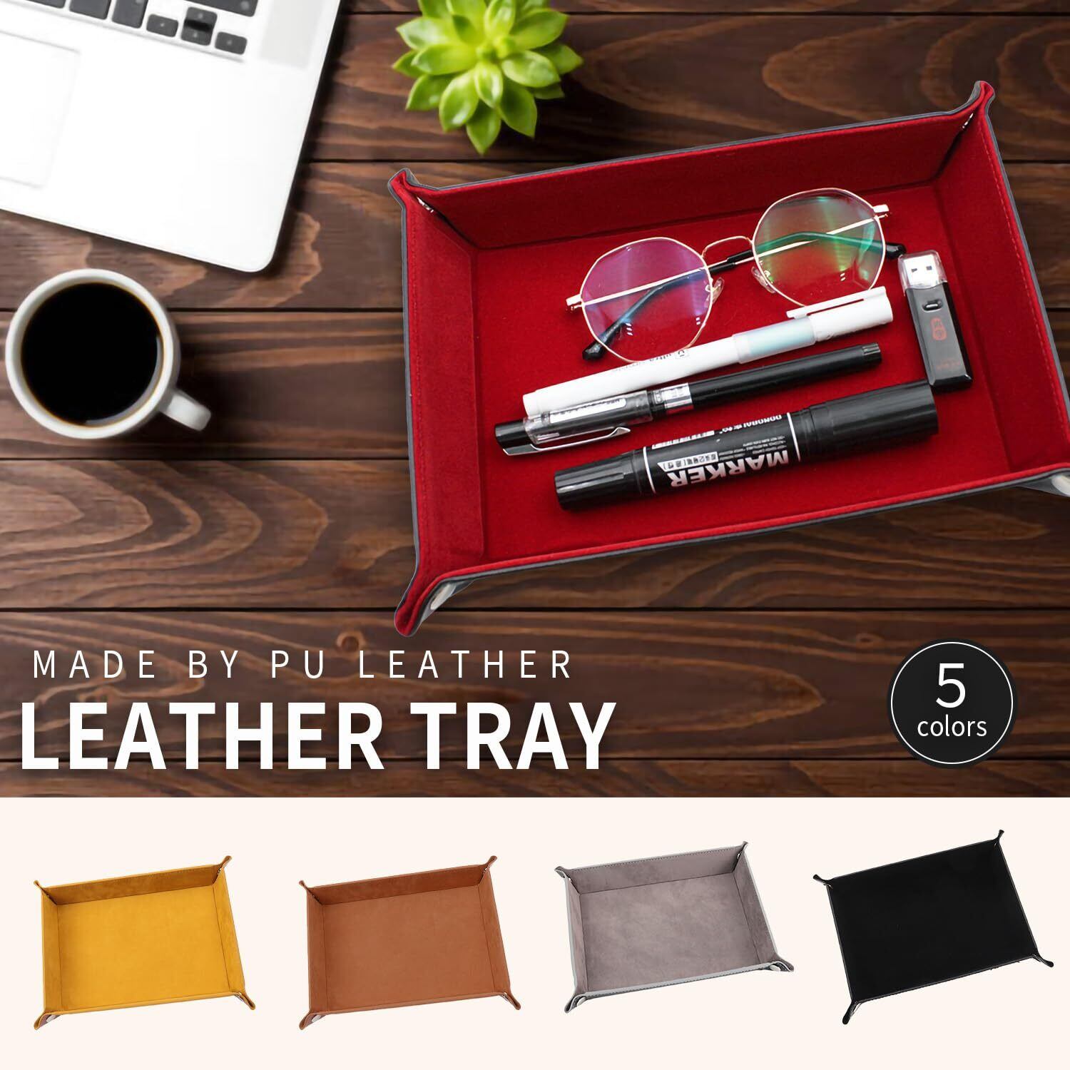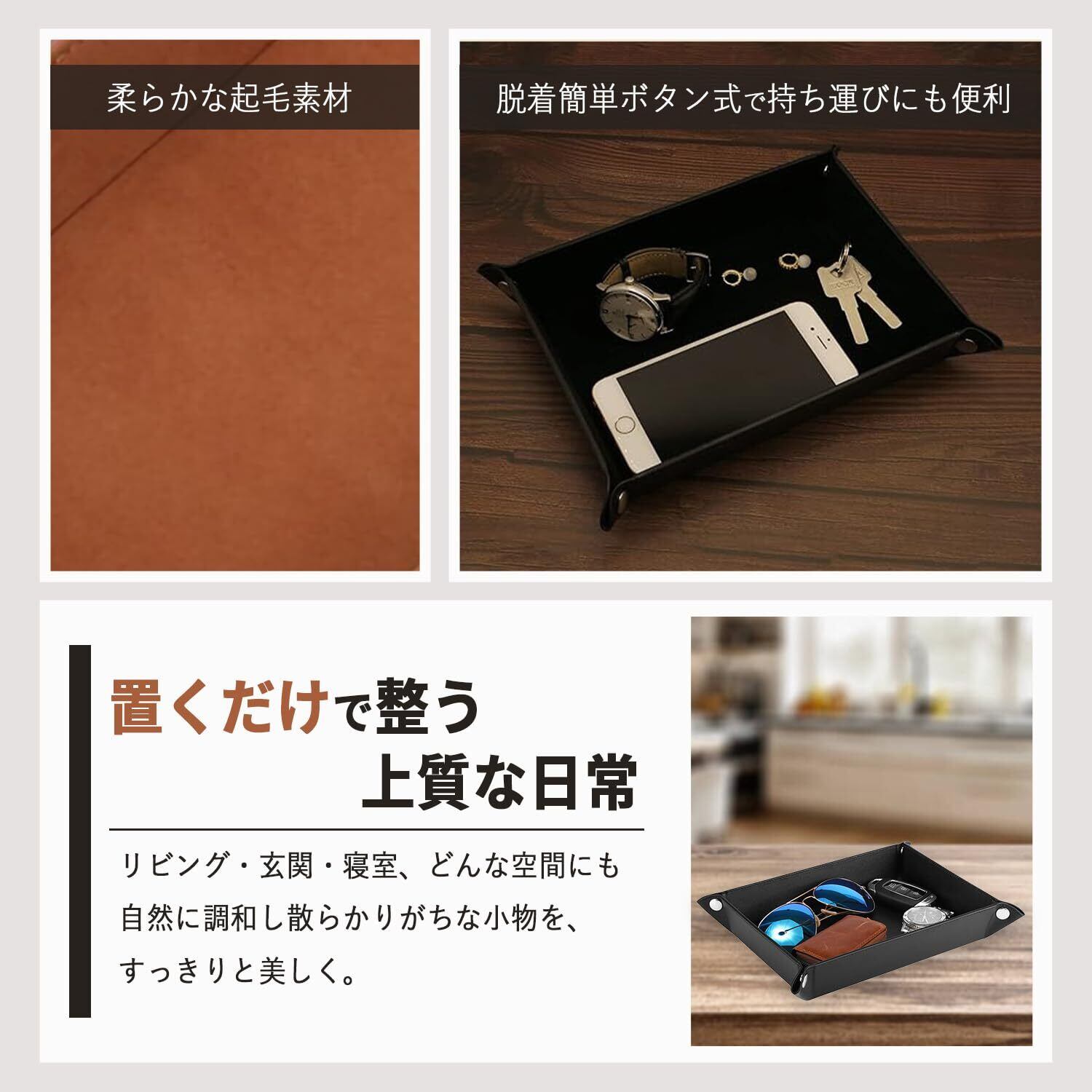 忘れ物防止・日常整理に最適なレザートレイ:20〜50代のビジネスマンや玄関・ベッドサイドで「鍵を置いたまま忘れる」「スマホや財布の置き場が曖昧になる」といった悩みに寄り添う、忘れ物防止トレイ。小物整理や収納トレイ、アクセサリー置き場としても活用できます。 高品質 PU レザー使用で耐久性と手入れのしやすさを両立:表面には上品な質感の PU レザーを採用し、耐摩耗性と撥水性に優れ、日常の使用に耐えうる設計。汚れがついても軽く拭くだけでメンテナンス可能です。レザー風でありながら手入れしやすい合成皮革素材です。 スナップボタンで折りたたみ可能・携帯性に優れる構造:4つのスナップボタンを留めるだけでトレイ形態に、外せばフラット状態で折りたたみ可能です。旅行や出張、オフィスや車内でも使える携帯トレイ設計。