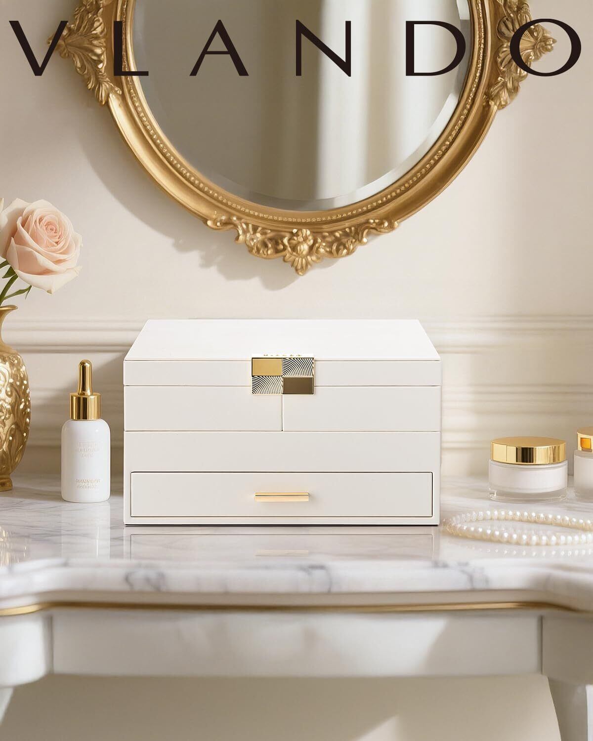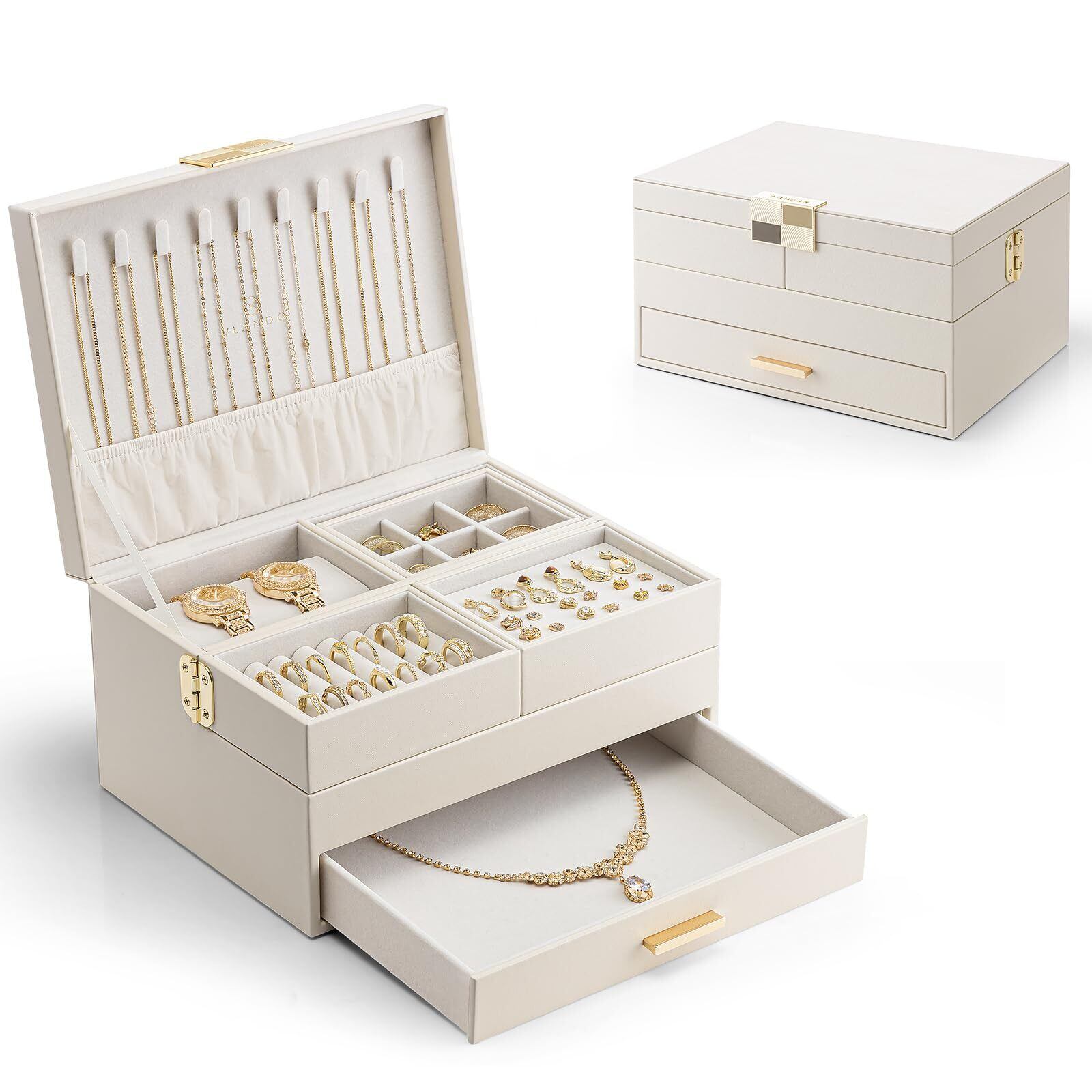 Vlandoジュエリーボックス 大容量 三層式 引き出しトレイ付き 回転可能 ネックレス リング イアリング ブレスレット用 ジュエリーオーガナイザー アクセサリー収納 プレゼント 誕生日 クリスマス 母の日 女性用(アイボリー)