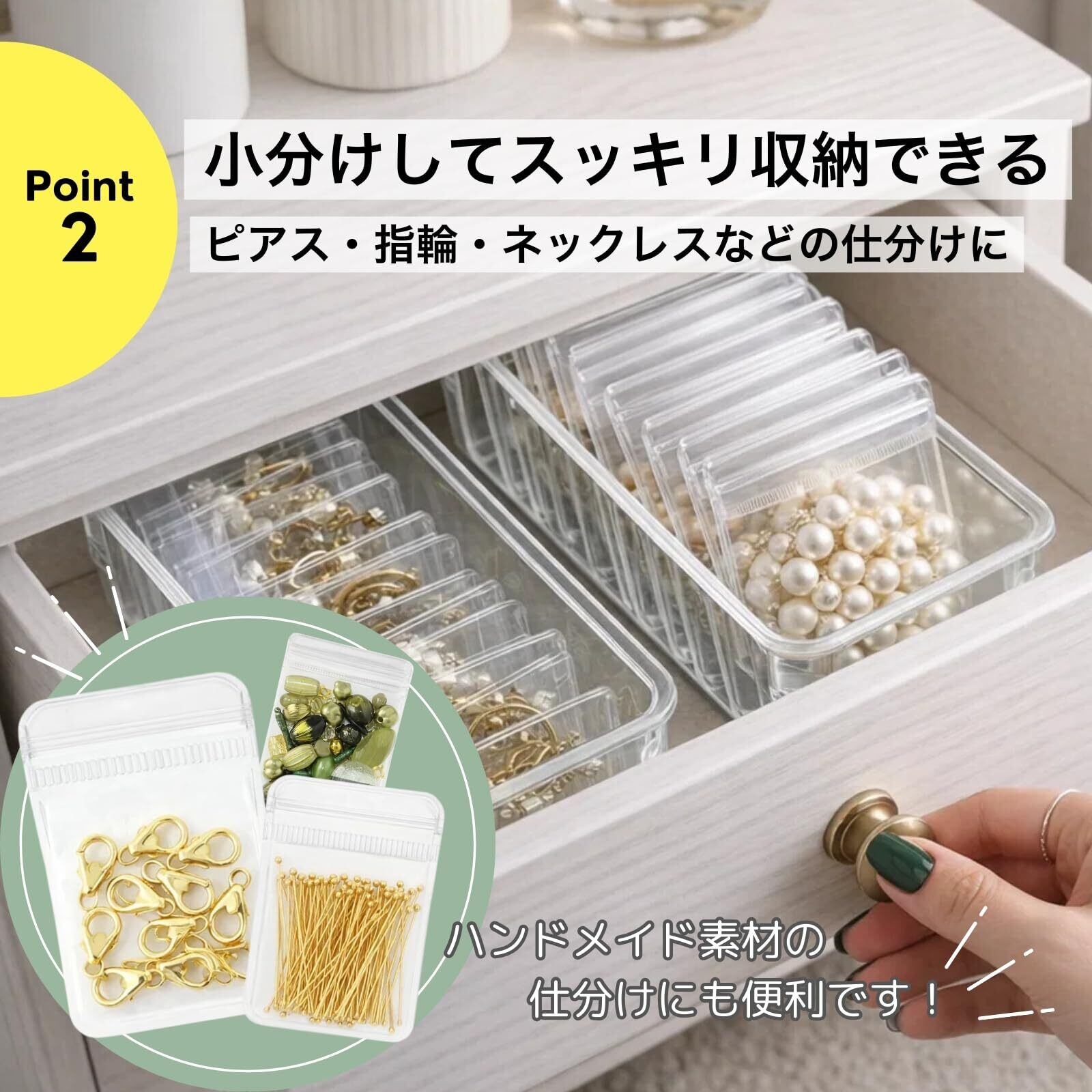 【中身が見える高透明PVC】透明PVC(ポリ塩化ビニル)で中身が一目で確認でき、目的のアクセサリーを素早く選べます。ピアス・指輪・ネックレスなどの仕分け、ハンドメイド素材の分類、店舗の在庫管理にも便利。クリアなので撮影・ディスプレイでも中身を引き立て、作業台の散らかり防止にも役立ちます。ラベル管理とも相性◎。