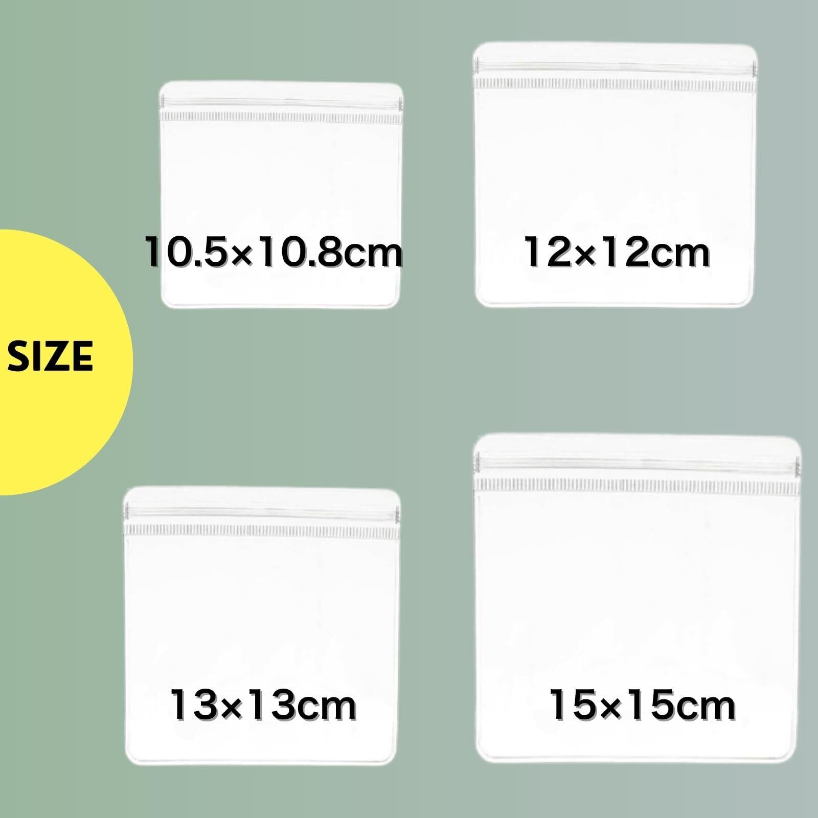 【サイズ・バリエーション】標準0.26mm/厚手0.48mmの2種類。4×6cm100枚、5×7cm100枚、6×8cm100枚、7×10cm50枚、8×12cm50枚、9×13cm50枚、10.5×10.8cm50枚、12×12cm50枚、13×13cm50枚、15×15cm50枚。カラー:透明(※サイズは目安、手計測のため誤差あり)。
