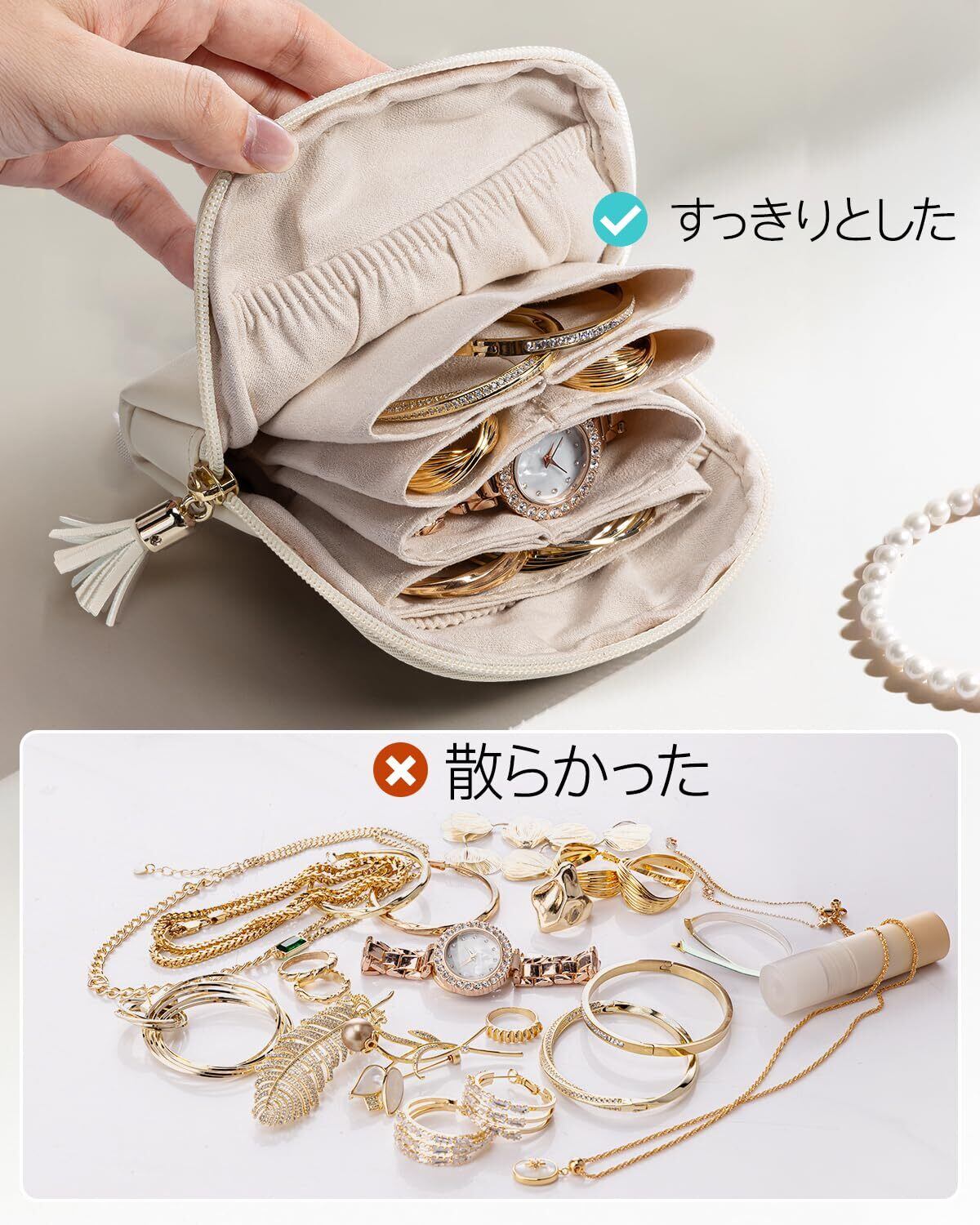 VLANDO ジュエリーポーチ 小物入れ アクセサリー収納 持ち運び コンパクト 化粧品収納 ポーチ 小銭入れ ピアス ネックレス 指輪 イヤリング 時計 小物 旅行 母の日(アイボリー) | 毎日発送✿はなまる