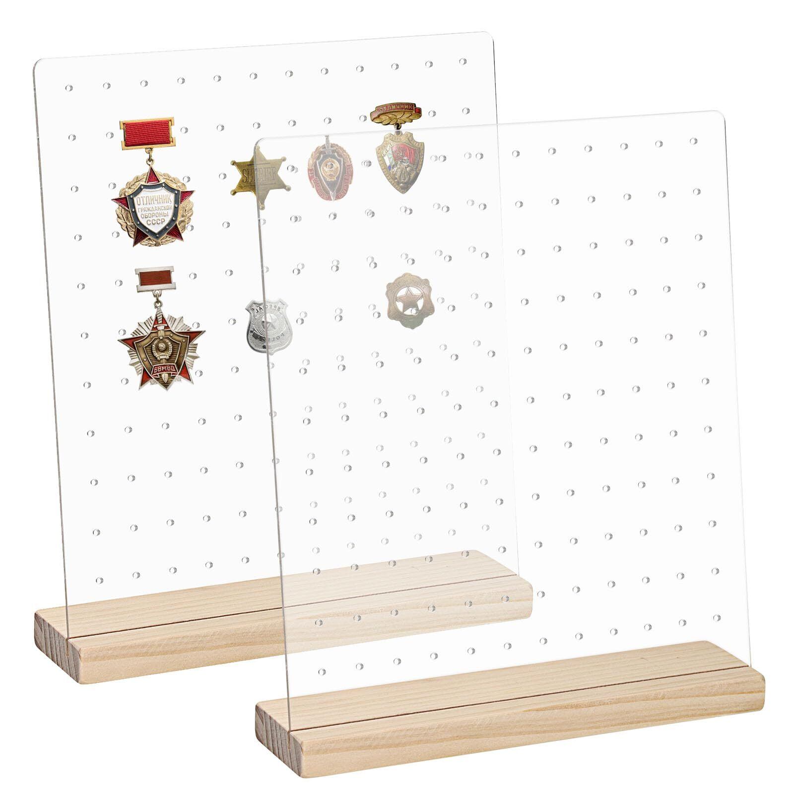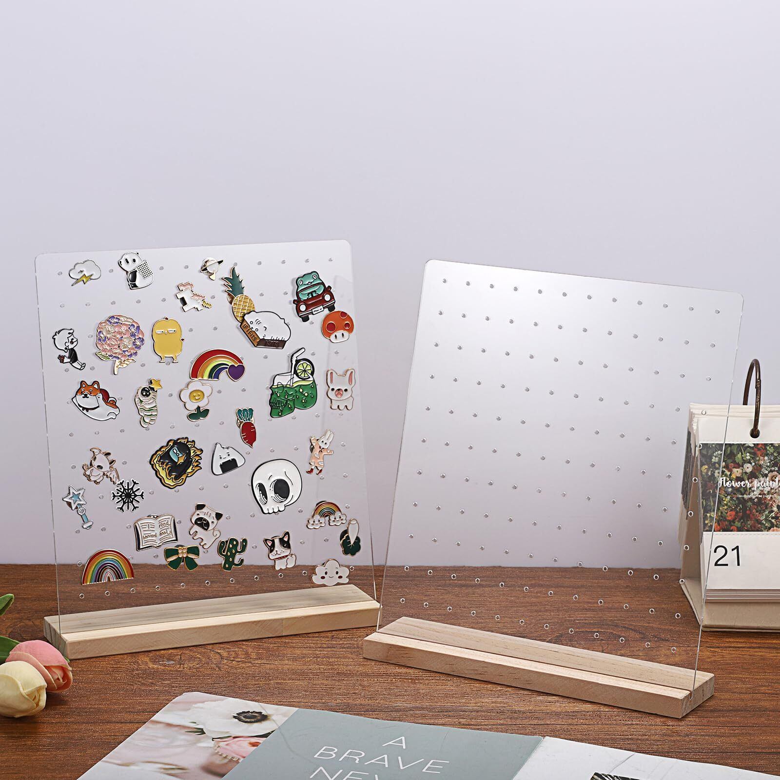 BSTKEY バッジディスプレイスタンド バッジホルダー 卓上 ピンディスプレイ 缶展示板 イヤリング収納 大容量 132ホール 透明アクリル板 木ベース 2本セット 縦型
