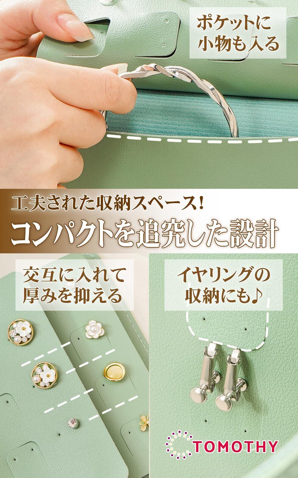 TOMOTHYのブック型ピアス収納ケースはスタイリッシュで機能的なデザインを兼ね備え42組のピアスをコンパクトに収納できる優れものです。 ピアスを効率よく整理整頓し場所を取らずに美しくディスプレイすることができます。 【コンパクトな収納力】 42組のピアス収納: このケースは42組のピアスを収納できるため多くのコレクションを一つの場所にまとめることが可能です。スペースを無駄にせず効率的にピアスを保管できます。 【ピアスの保護設計】 交互収納: ピアス同士が干渉しないように交互に配置できる設計になっており破損のリスクを最小限に抑えます。これにより大切なピアスを安全に保管できます。 【カラーバリエーション】 3色展開: ピンク、ブルー、グリーンの3色からお選びいただけます。お好みやインテリアに合わせてお選びいただけるカラーバリエーションが魅力です。 【多機能ポケット】 ブレスレットやヘアアクセサリーなどの小物も収納できるサイドポケットが付いています。これ一つで様々なアクセサリーを整理することができます。 【PUレザー素材】 水を弾くレザー素材で作られており「汚れにくく」「お手入れも簡単」 【軽量設計】 重さはわずか200g。軽量なので持ち運びにも便利です。旅行や出張時にも活躍します。 【使用シーン】 このブック型ピアス収納ケースは自宅での使用はもちろん、旅行や出張などの外出時にも便利です。コンパクトなデザインでありながら、大容量で多機能な収納力を備えているためどんなシーンでも大活躍します。 特に多くのピアスを持っている方や異なる種類のアクセサリーを一つにまとめたい方に最適です。