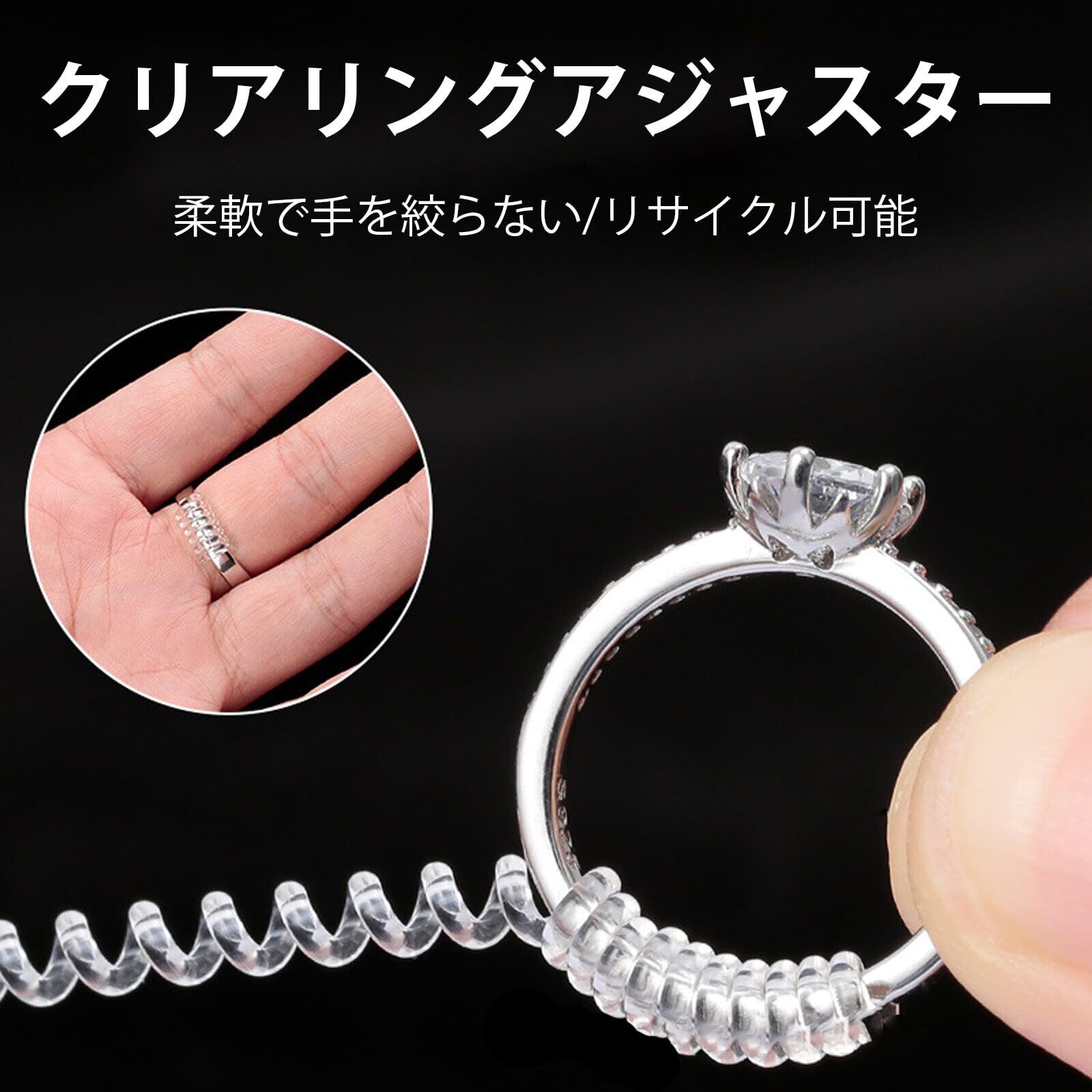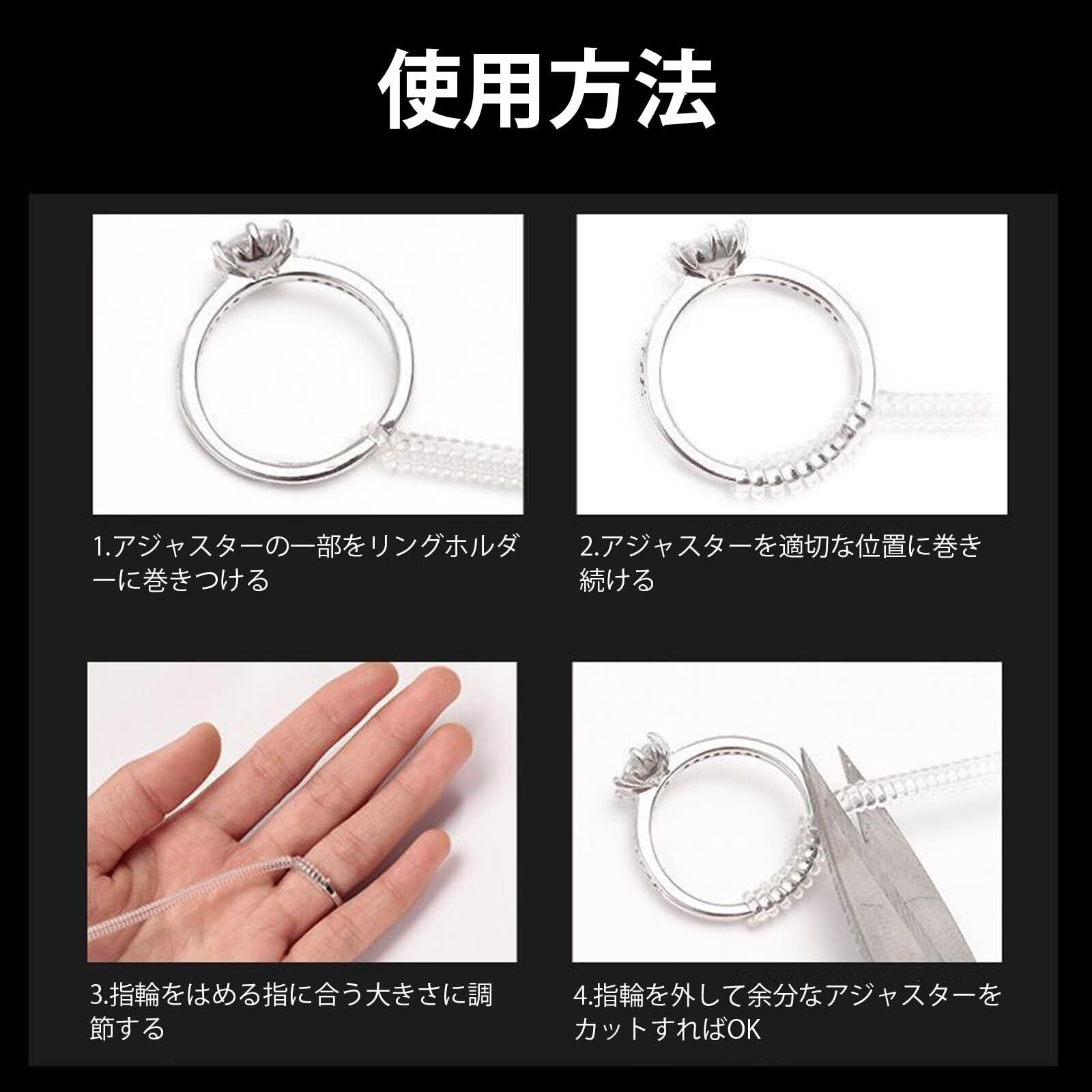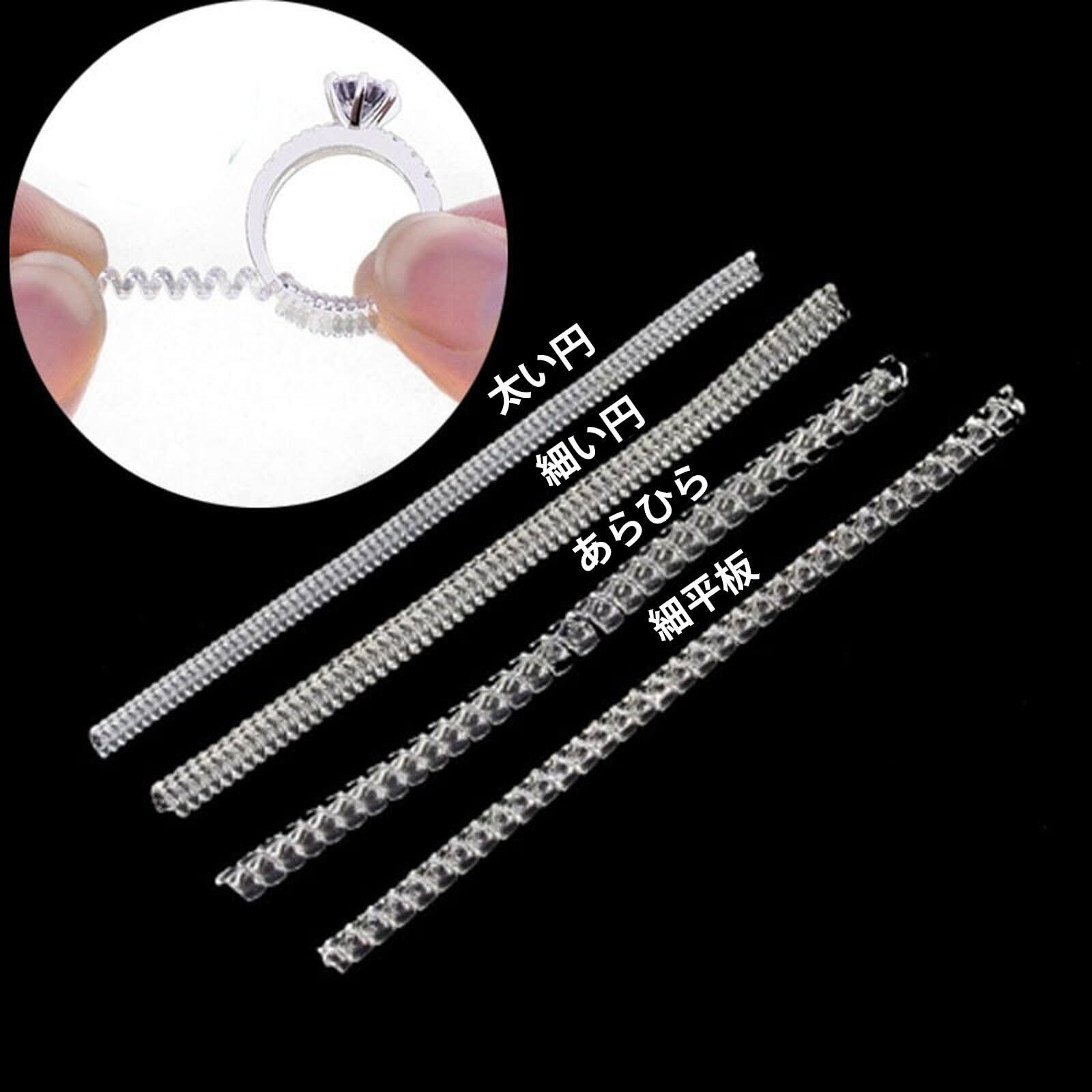 【4本セットサイズの違う】様々な指輪に対応するため、サイズ違いの4本セットでのご提供です。カットしやすく巻き付けやすい、肌にも優しいシリコン製のリングアジャスター。 耐久性も有り、透明で内側に装着するタイプなので目立ちにくく、着用感も違和感がありません。