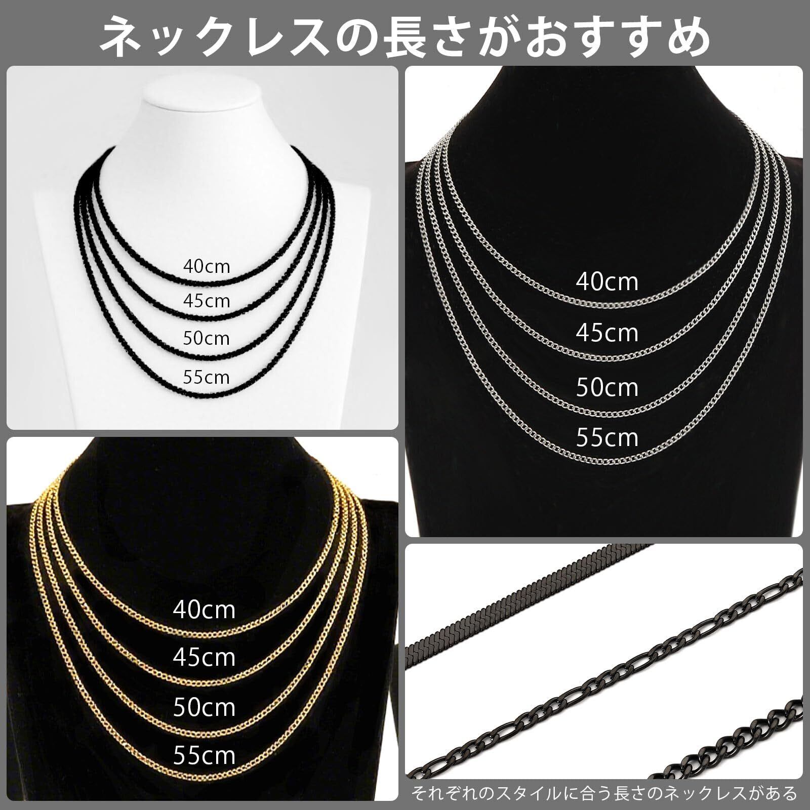 【5種類サイズ】喜平ネックレスは、40cm、45cm、50cm、55cm、60cmから選べます。チェーン幅は、喜平チェーン:5mm、フィガロチェーン:5mm、ヘリンボーンチェーン:4mm。どんな体型の方にもフィットし、男性らしさを引き立てたい方に最適なネックレスです。