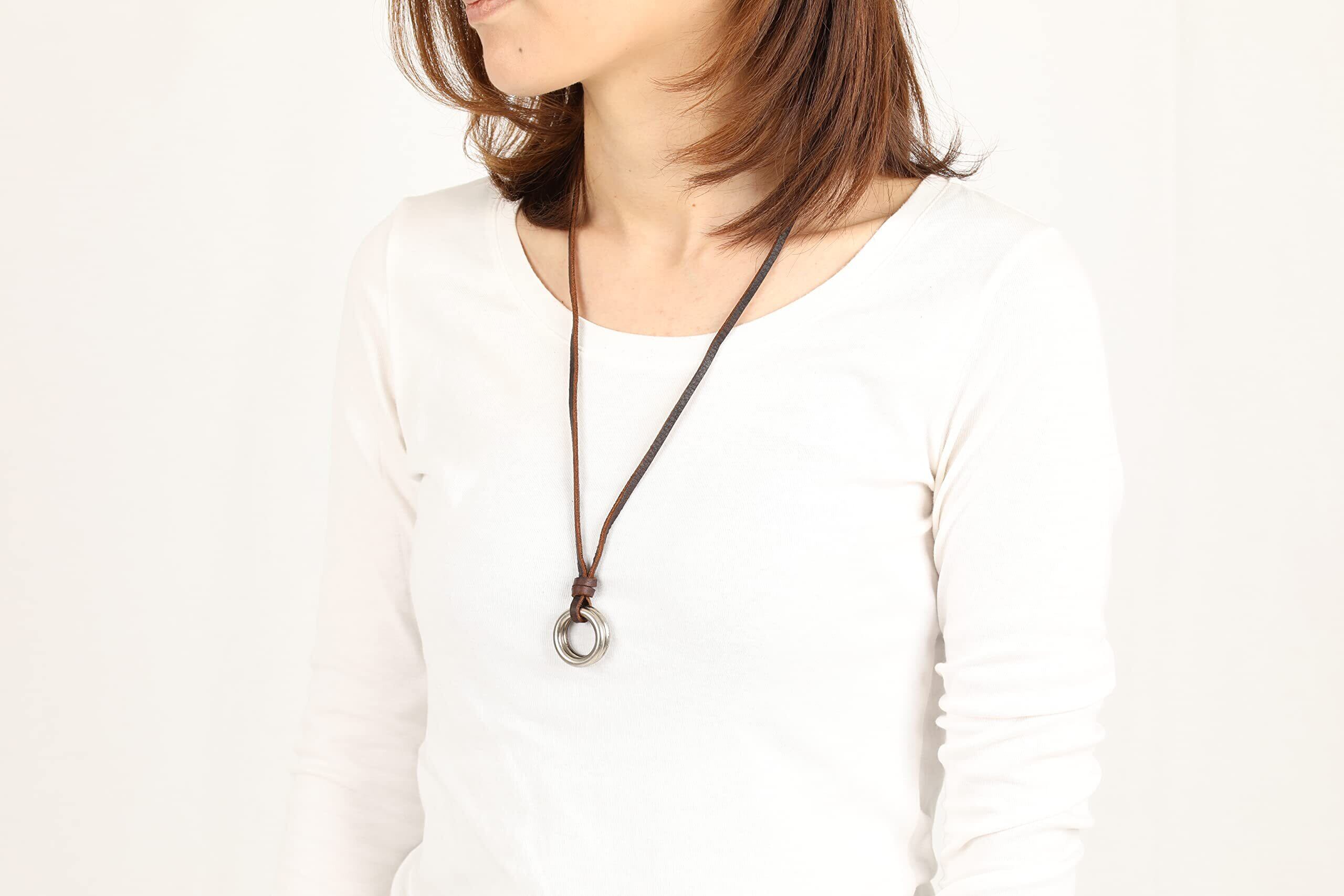 正規品 レザー リング ネックレス 革紐 ユニセックス ロング アクセサリー ジュエリーポーチ付き(ブラウン)