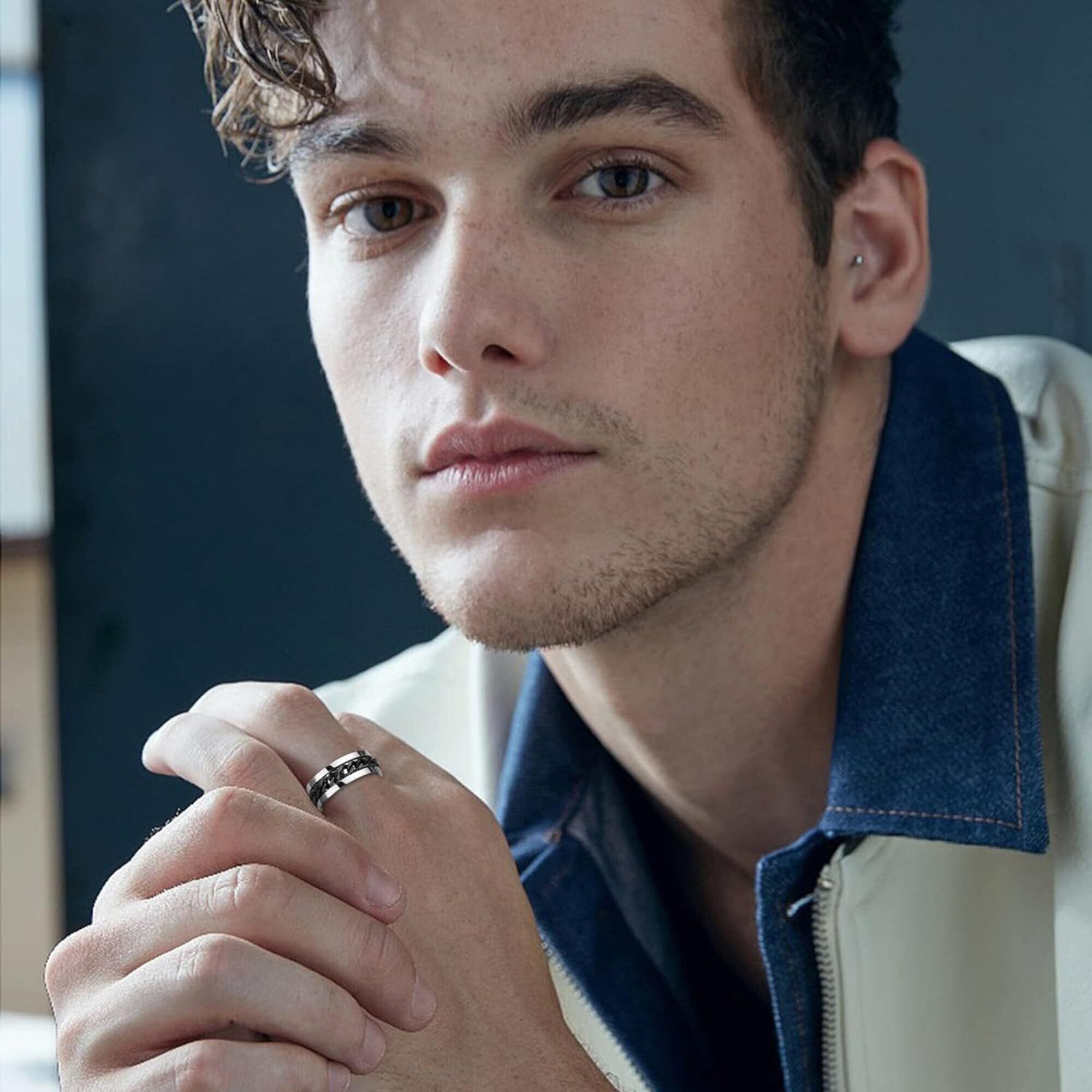 【不安を和らげる黒いフィジェットリング】-回転するデザインの黒いフィジェットリングは、日常生活で集中し、退屈を和らげ、スピーチ中の不安を和らげ、正式な機会のストレスを和らげるのに役立ちます。自分自身、友人、兄弟、ボーイフレンド、父親への素晴らしい贈り物です。
