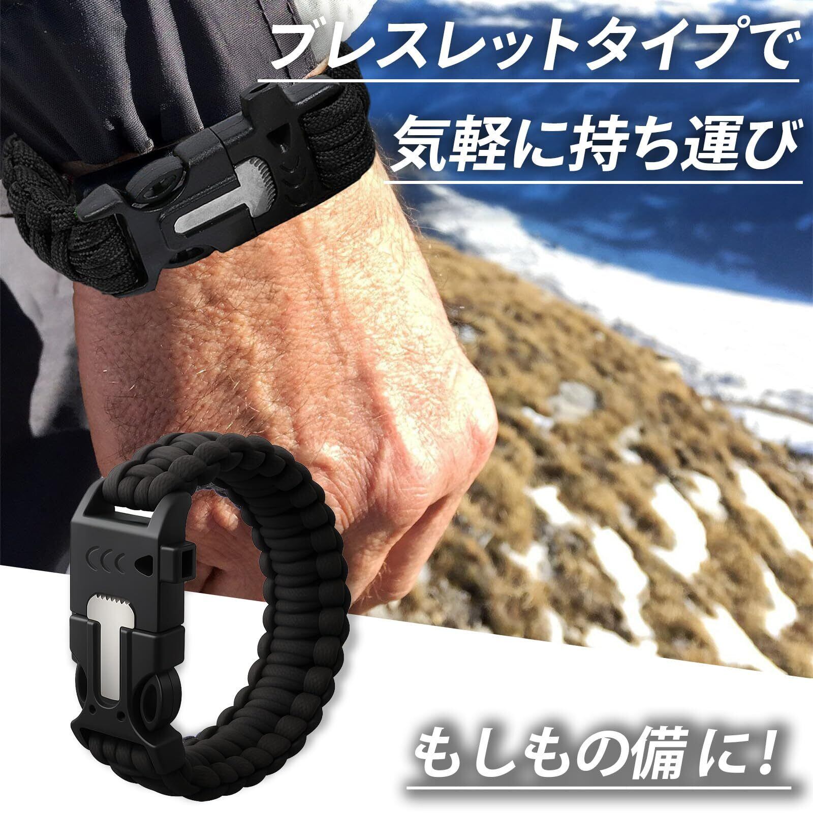 【登山などの緊急時に対応】緊急対応に必要なホイッスル、火起こしツール、コンパスがすべて揃ったブレスレット。防災、災害対策として身につけておくだけでもしもの時に役立ちます。。