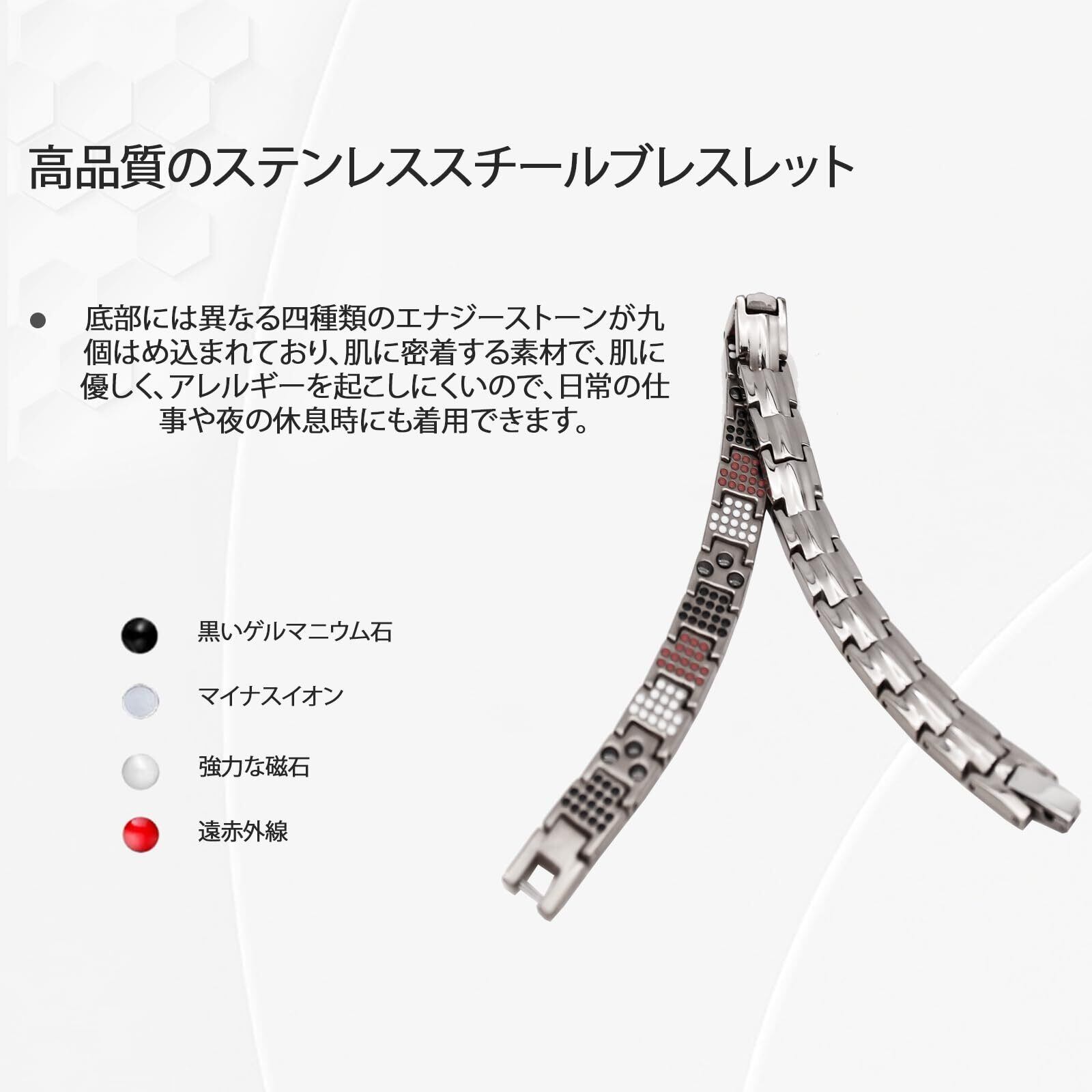 健康機能デザイン:磁気ブレスレットの内側に、遠赤外線・マイナスイオン・ブラックゲルマニウム・強力磁石(3500ガウス)を配置。磁気効果が静電気除去。敏感肌の方も安心。日本製の高品質素材で、日常的な健康習慣を手軽にプラス。