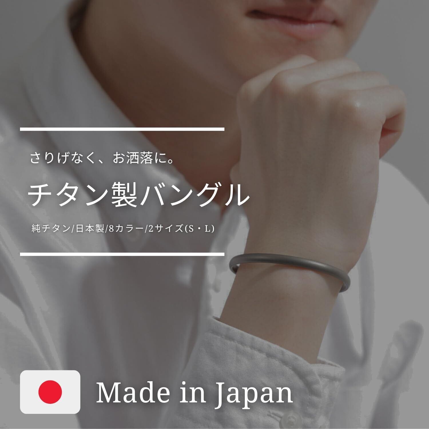 【あんしんの日本・鯖江製】メガネ枠の国内最大生産地である福井県鯖江市ですべての加工を行っています。チタン製メガネ枠の技術を活かして、スタイリッシュなバングルを製作しました。