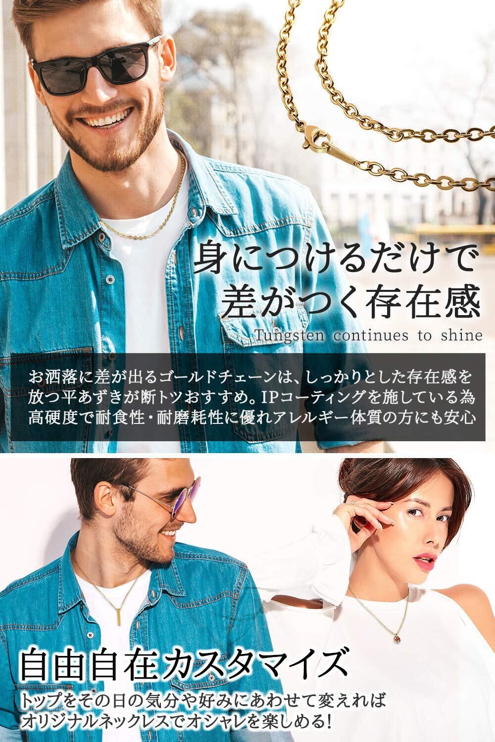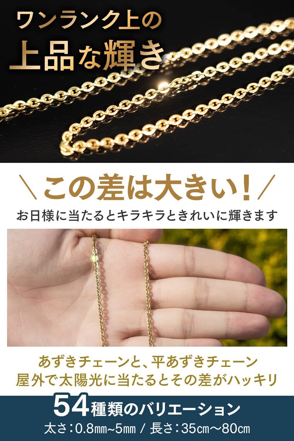 【キラキラ輝くゴールド平あずきチェーン】高品質IPコーティング(イオンプレーティング)で色落ちせずいつまでも輝きがあせません。向きが交互に異なる構造により平面が光を受けてキラキラと輝くのが特徴です。リング同士の隙間がほど良い抜け感を演出し派手過ぎない上品さを醸しだしてくれます。シンプルにチェーンだけでもおしゃれ度を上げてくれます。