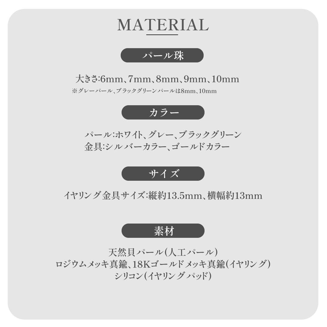 【さまざまなサイズをご用意しました】イヤリングのパール珠はホワイトは6~10mmまで、グレー・ブラックは8mm・10mmサイズをご用意しました。ご利用シーンやお洋服に合わせてお気に入りのサイズが見つかります。さらにシリコンパッド付だから長時間の着用でも痛くなりにくい!! 汚れを拭くミニクロス&イヤリング用ミニ巾着をセットにして、ギフト用にもオススメです。