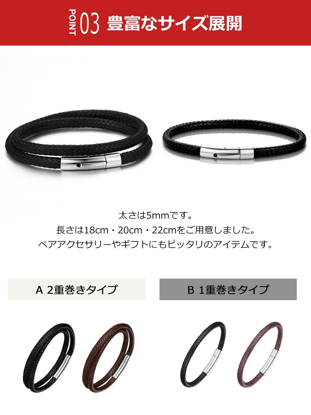 [豊富なバリエーション] 4タイプから選べる、バラエティ豊かなブレスレット。ブラウンとブラックの2種類、それぞれ18cm、20cm、22cmをご用意しました。