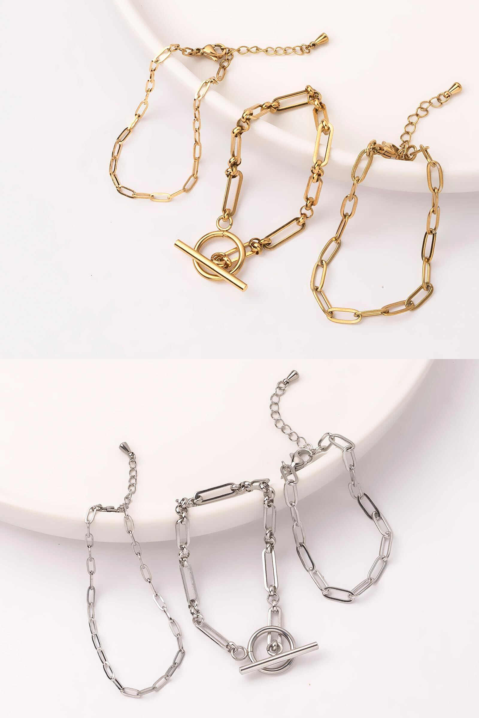 【上品な輝きを放つスオーバルマンテルチェーンブレスレット】 細長いバーと小さなリングを交互に組み合わせたデザインが、洗練された印象を演出します。 留め具には人気のTバー(マンテル)を採用し、着脱が簡単でデザインのアクセントにもなります。 カジュアルからフォーマルまで、どんなスタイルにもマッチします。