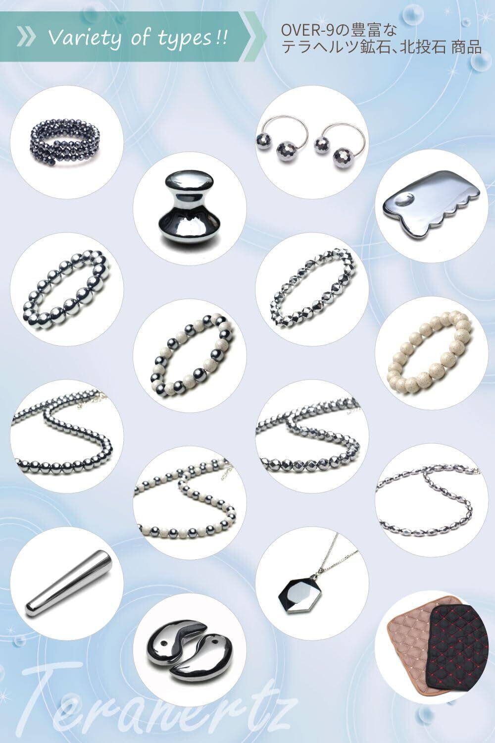 【&ROSY、美STに掲載】OVER-9のテラヘルツ鉱石は今注目の人工鉱石です。1秒間に1兆回もの分子振動が起こる事から、テラ(1兆回1TERA)ヘルツ波(周波数)と言われています。遠赤外線を超えると云われるテラヘルツ波は素晴らしい新エネルギーであり、人体への悪影響もなく植物が腐りにくくなるなど、テラヘルツ波は育成光とも呼ばれています。