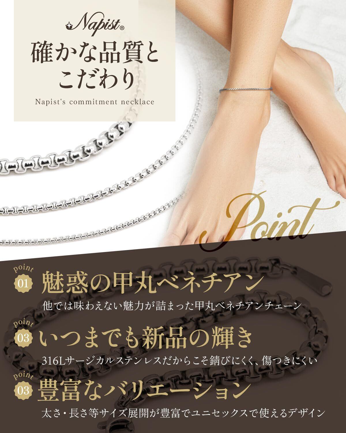 【 人気のベネチアンチェーンアンクレット 】甲丸ボックス型のピースを交互に組合せたチェーンで別名ボックスチェーンとも呼ばれます。直線的なシルエットと密度のある構造は高級感と柔軟性を併せ持ちます。ベネチアンチェーンは強度が強く、絡まりません。男性、女性、年齢、シーンに関わらず、カジュアルにも身に付けていただけます。流行に左右されない輝きが魅力のメンズアンクレット・レディースアンクレットです。