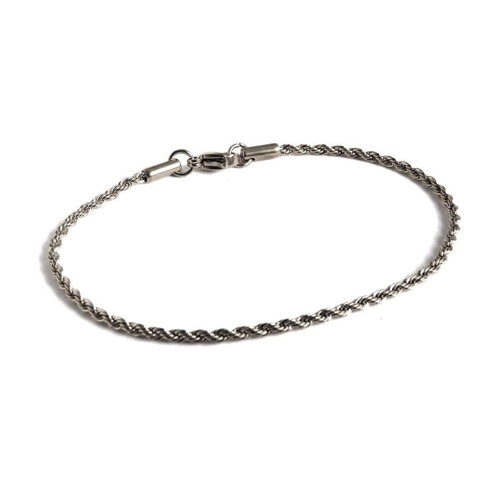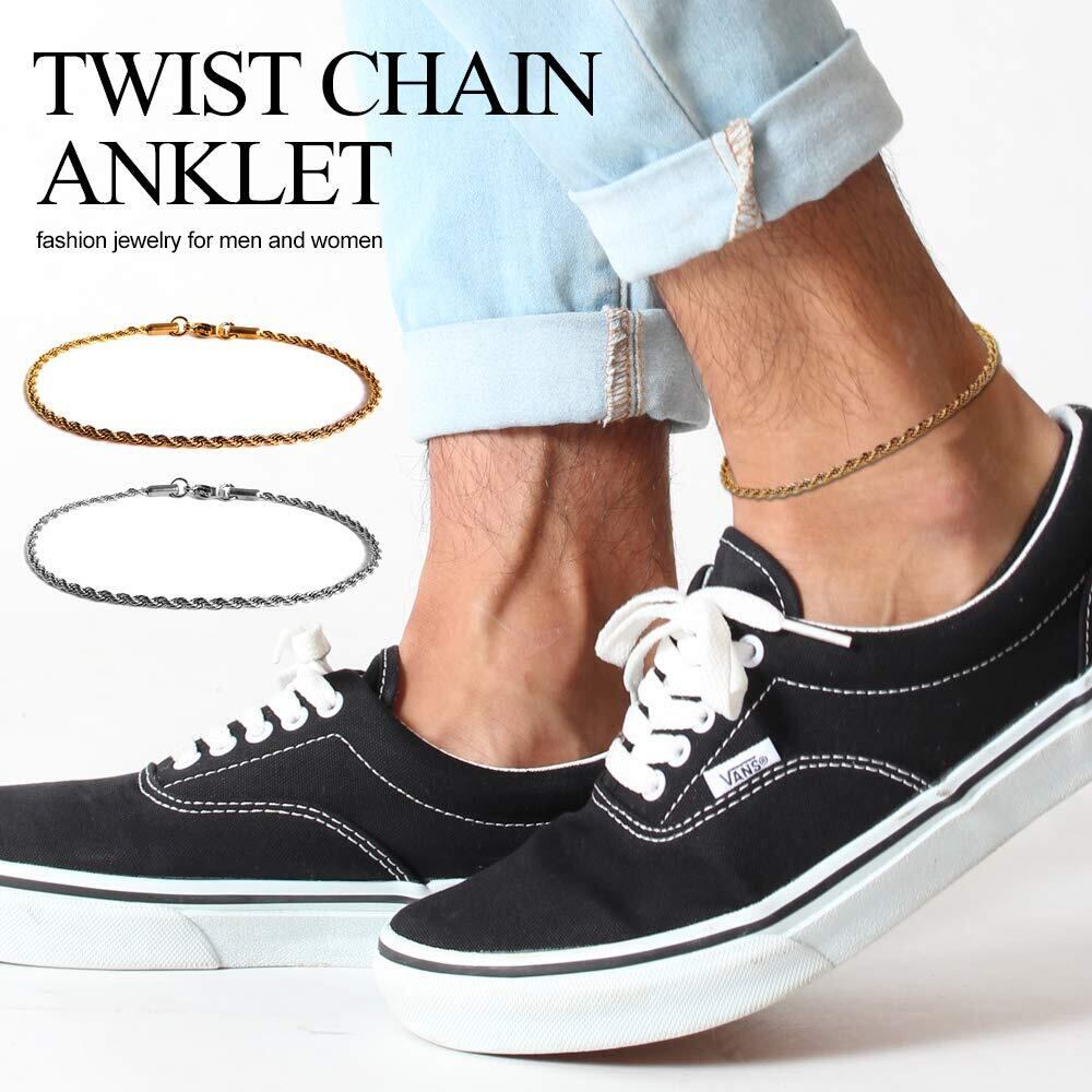 普段使いに最適なシンプルロープチェーンアンクレット。メンズにもレディースにも人気の高いデザインでどなたにでもおすすめできるシンプルなユニセックスチェーンアンクレット! ツイストされたチェーンでそのままでもお持ちのアンクレットと重ねづけしてもしっかりデザイン性のあるチェーンです。 フォーマルスタイルにもカジュアルスタイルにも相性がよく、シーンを選ばずどんな時でも着用OK! カラーバリエーションはゴールドとシルバーの2色展開で太さは2mm、長さも各種取り揃えてあり、自分の好みにあったサイズを選択可能。 自分の足首周りの長さにプラス1cmのチェーンの長さをおすすめします。きれいな輝きで存在感を強調しオシャレにコーディネートすることができます。 若者に人気のストリートファッションとの相性抜群で、これは外せない1つは必ず持っておきたいアンクレット!