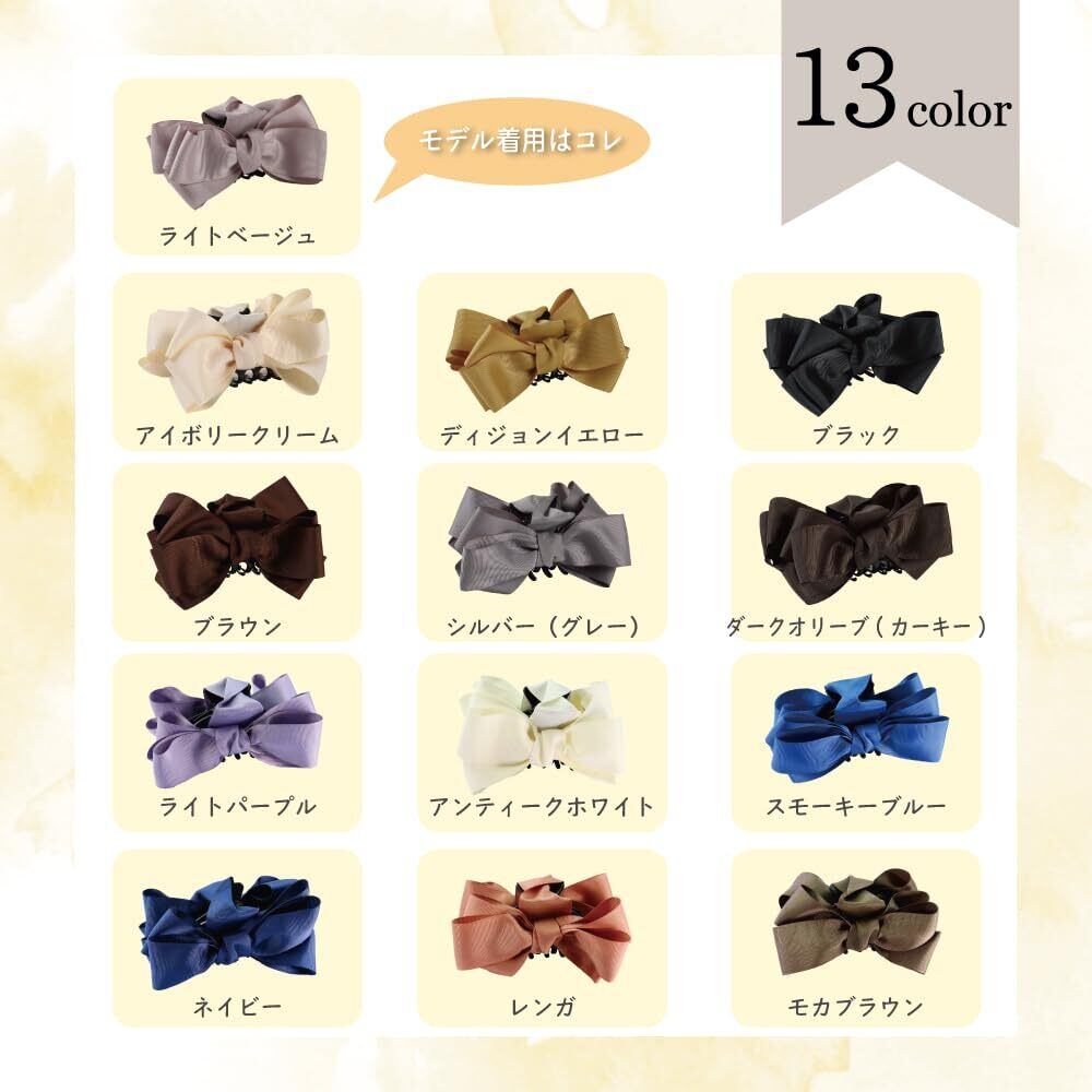 【必ずお気に入りが見つかる13カラー】リボンのお色味は13色をご用意。デイリーで使える色なので、気分に応じてカラーを変えても◎。年間を通じてご利用いただけるマストのヘアクリップですさらに持ち手の台座までしっかりリボンで隠しているため、髪にセットしても可愛さをキープします。