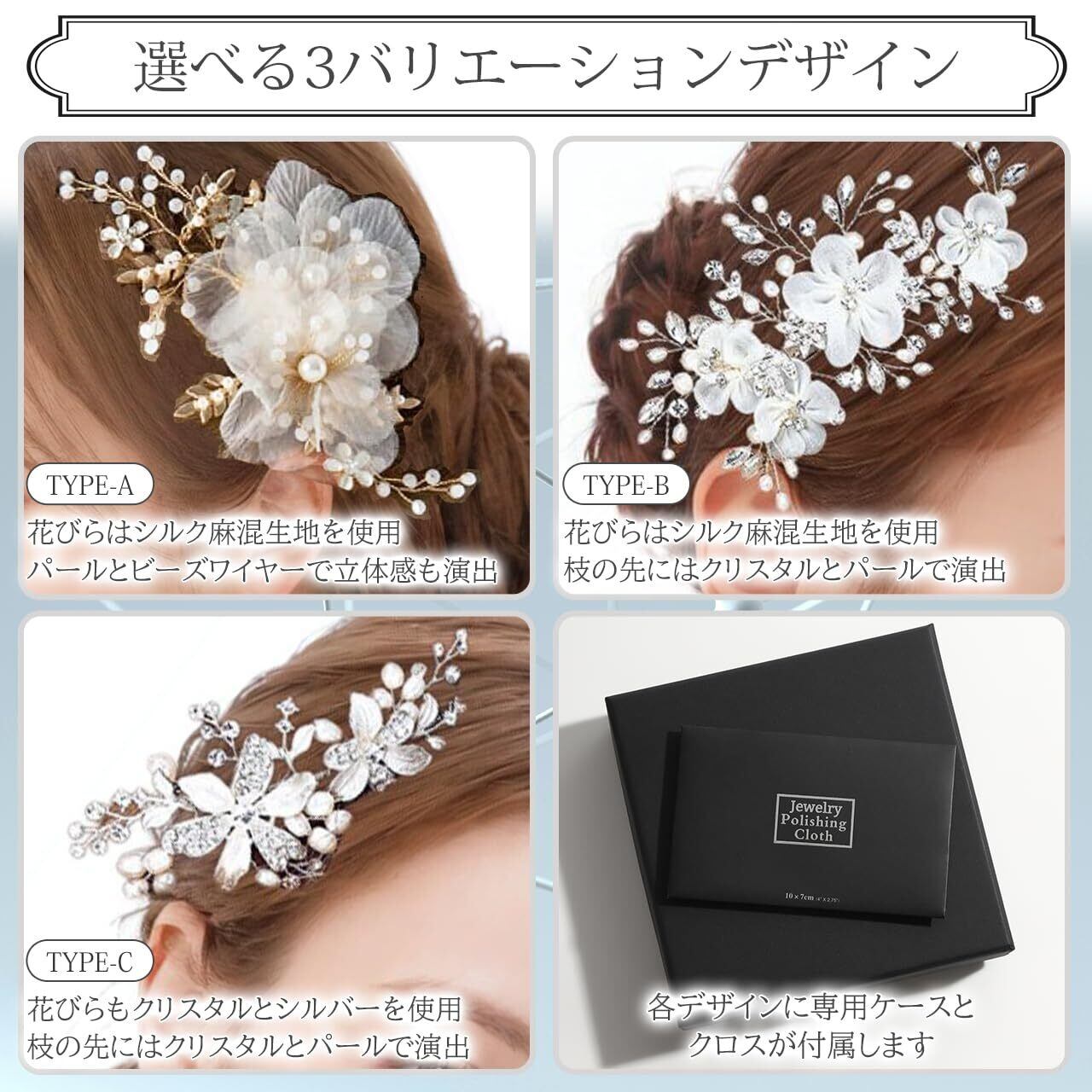 【選べる3タイプ】モチーフの違う3種類の髪飾り。着物やドレスに合う髪にクリップで挟んだり、コームを挿すだけで簡単にヘアアレンジが出来ます。ワイヤー部分は指で動きをつけてお好みの形に整えれます。サイド、シニヨンなど付ける位置を変えることで華やかなイメージを変えることができます。
