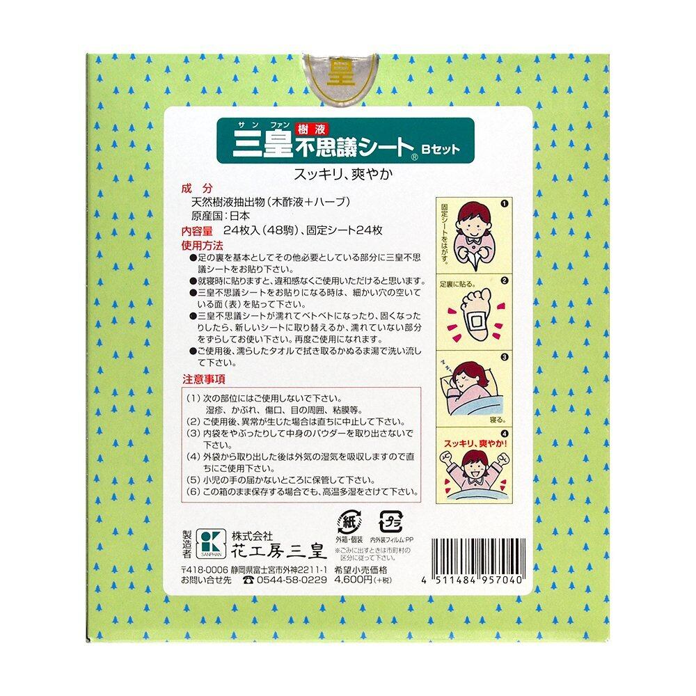 樹木の強い生命力を凝縮させた不思議パワーの結晶!「三皇樹液不思議シート Bセット」は、木酢液に72種類のハーブを配合し乾燥させてパウダーにし、和紙にキルティングしたシートに包んで製法された樹液シートです。スポーツ後やおやすみ前に足の裏・ひざ・ふくらはぎなどにお貼りください。足がすっきりします。足の裏だけでなく、肩、肘、膝、腰などに貼ることもできます。●足の裏を基本としてその他必要としている部分に三皇不思議シートをお貼り下さい。●就寝時に貼りますと、違和感なくご使用いただけると思います。●三皇不思議シートをお貼りになる時は、細かい穴の空いている面(表)を貼って下さい。●三皇不思議シートが濡れてベトベトになったり、固くなったりしたら、新しいシートに取り替えるか、濡れていない部分をずらしてお使い下さい。再度ご使用になれます。●ご使用後、濡らしたタオルで拭き取るかぬるま湯で洗い流して下さい。