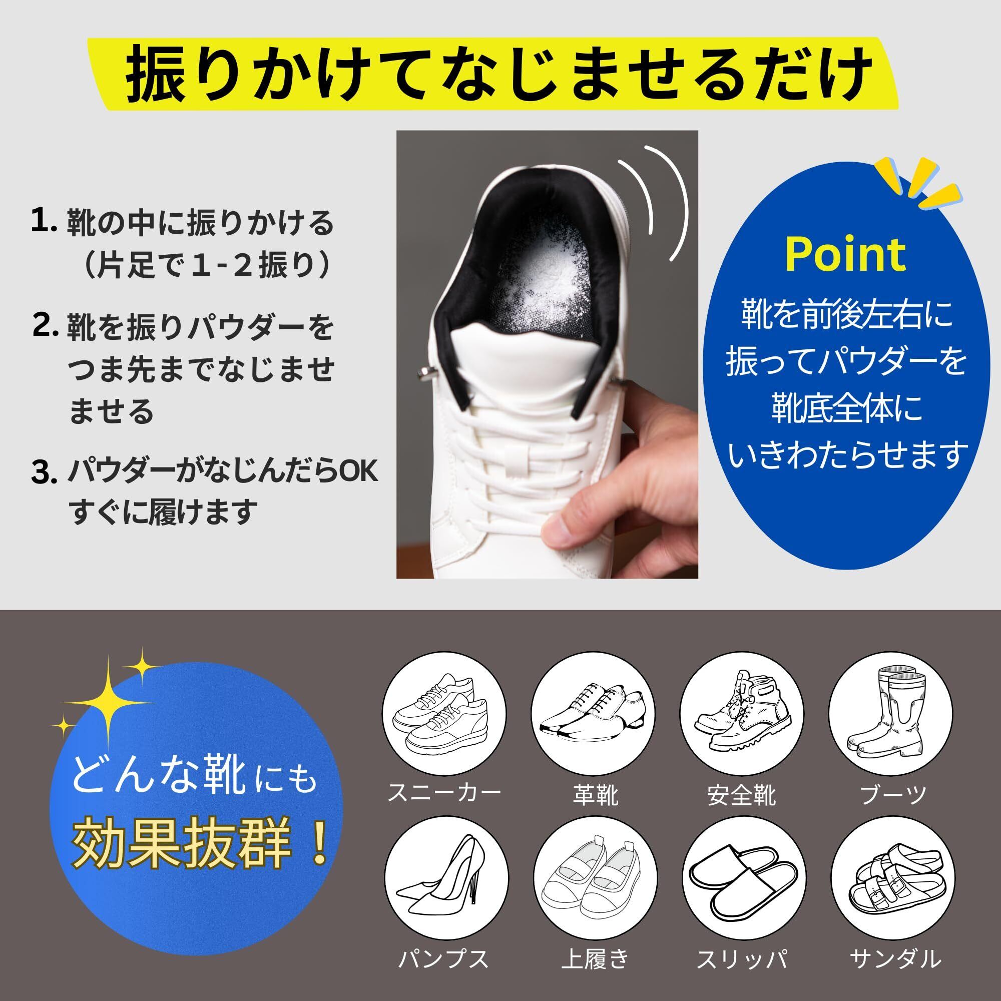 【安心の日本製。品質と効果にこだわった靴用消臭剤】本製品は日本国内の厳格な品質管理のもとで製造されており、高品質な天然成分を使用した靴の匂い消し。合成香料や化学薬品を含まないため、肌に優しく、靴にも負担をかけません。市販の消臭スプレーや竹炭消臭剤とは異なり、根本からニオイを除去する実力派のパウダータイプ。ニオイの元となる雑菌を強力に吸着・除菌することで、即効性と持続性を両立し、靴の中を長時間快適な状態に保ちます。毎日の靴のメンテナンスに、新しい習慣として取り入れてみてください。