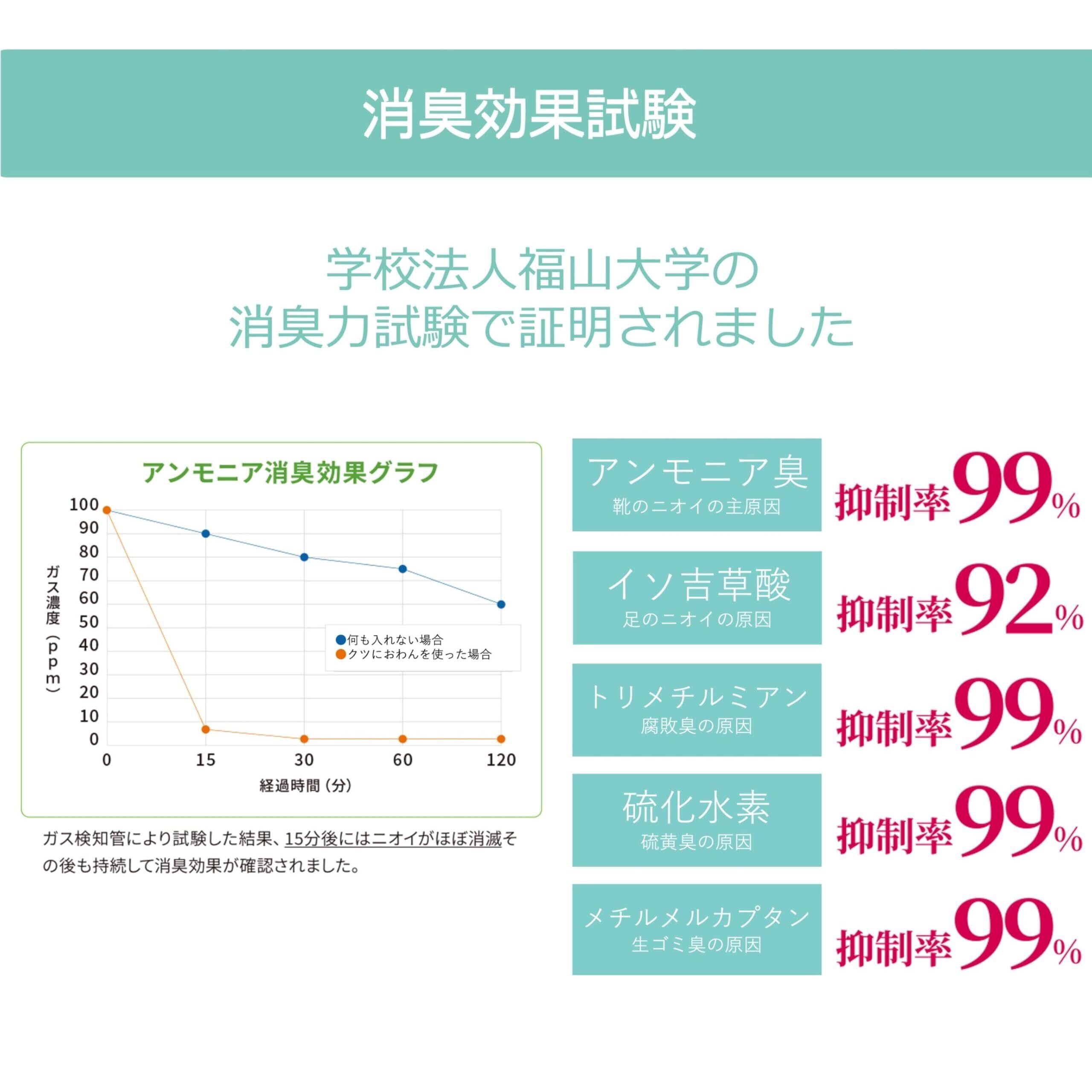 消臭効果実証済み性能: 福山大学での試験により、アンモニア臭(靴の匂いの主原因)・イソ吉草酸(足のニオイの原因)・トリメチルミアン(腐敗臭の原因)・硫化水素(硫黄臭の原因)・メチルメルカプタン(生ゴミ臭の原因)消臭効果が実証されています。