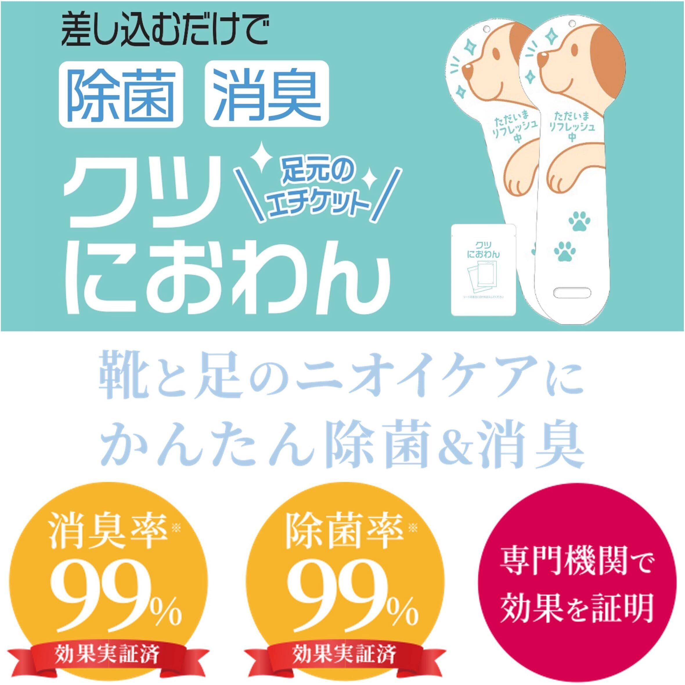 クツにおわんは、靴の消臭と除菌を簡単に実現する革新的な製品です。靴に入れるだけの簡単な使用方法で、靴内部の不快な臭いや雑菌に効果的にアプローチします。消臭・除菌効果は専門機関での試験により実証されており、99%の高い効果が確認されています。かわいらしいデザインで、靴箱やクローゼットの見た目も損ないません。無香料ですので匂いが気になる人も安心して使用できます。独自の化学反応メカニズムにより、CLO2分子が空気中の水分と反応して酸素原子を生成し、靴内の気になるニオイの原因を分解します。主成分の亜塩素酸塩は、水道水の消毒や食品加工など、日常的に使用されている安全性の高い成分を使用しています。靴の種類を問わず使用でき、靴と足のケアに最適なアイテムです。安心して毎日の靴のケアにお使いいただけます。