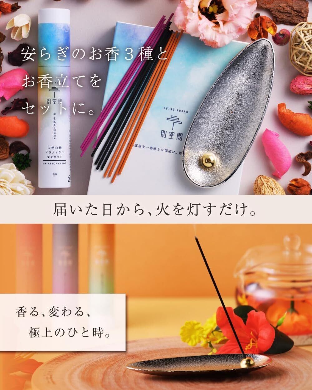 ️【別空間 お香3種類 お香たて付き】お香3種類とお香たてを一緒に。天然白檀、イランイラン、マンダリンオレンジが各種入って、毎日違う香りを楽しめます。