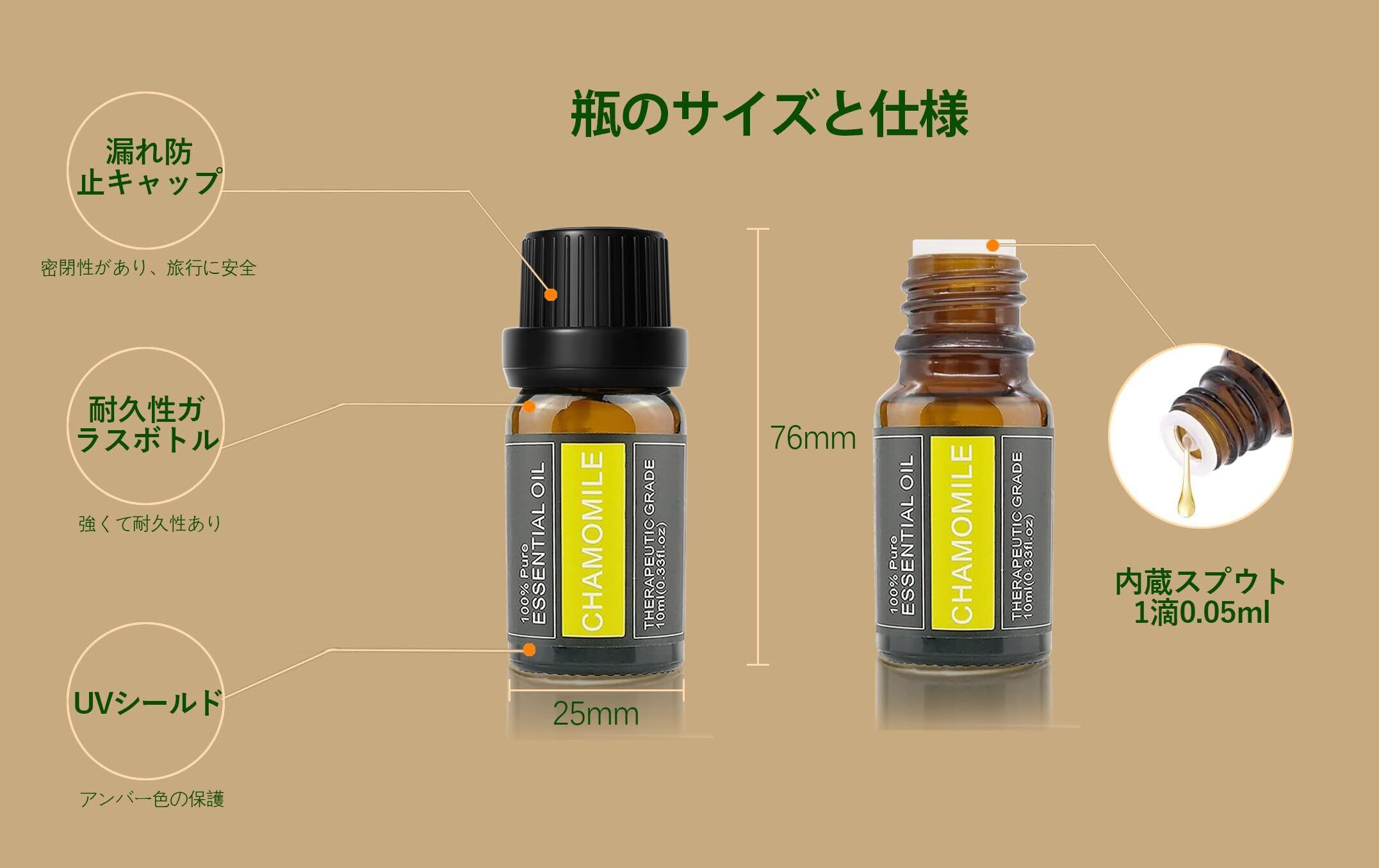 【密封抗酸化設計】厚手で衝撃に強い遮光瓶を採用しており、未開封時には長期間エッセンシャルオイルを保存可能で、酸化を防ぎます。ボトルの口部分の設計により、再販売を防止します。開封後は、最良の効果を保つために6ヶ月以内にご使用ください。 【仕様】1滴の容量は約0.05mlです。