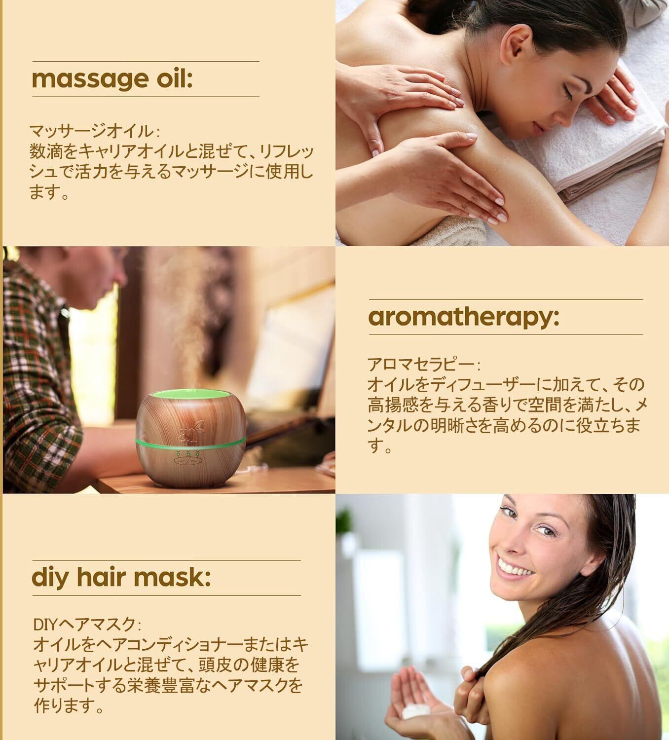 【標準セット】を選択:10ml のエッセンシャルオイル1本(さまざまな香りや組み合わせを選択可能)。DIY石鹸、シャンプー、清掃用品、車内のフレグランス、パーソナルケア、美容製品、衣類の香り付け、シャワーやアロマキャンドルに適しています。また、エッセンシャルオイルをキャリアオイルに加えてマッサージにも使用できます。アロマディフューザー、加湿器、エッセンシャルオイルディフューザー、スプレーボトル、アロマストーンなどのデバイスと組み合わせて使用することも可能です。
