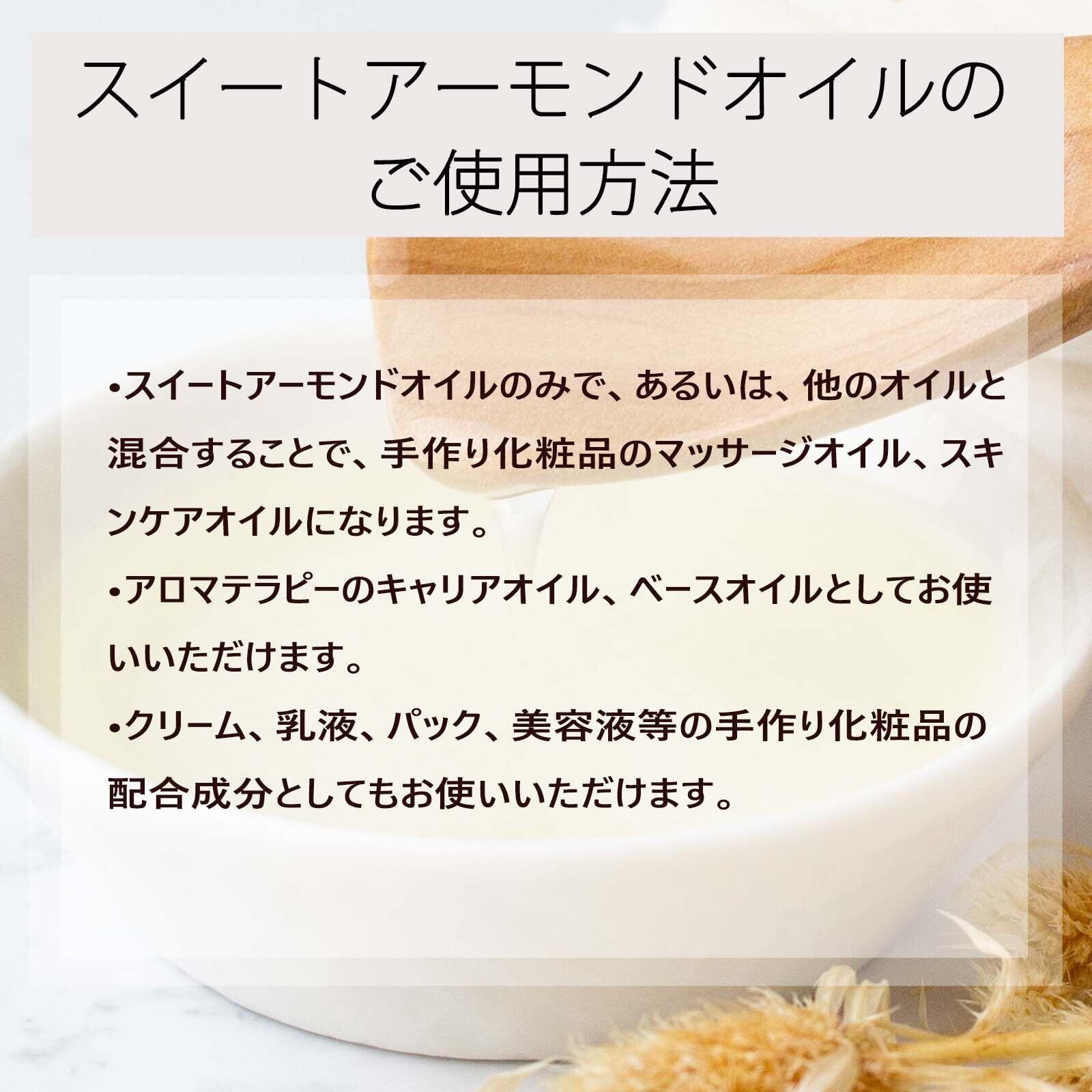 アーモンドの種子から丁寧に圧搾し抽出したオイルです。香料・防腐剤無添加の100%ピュアなスイートアーモンドオイル。