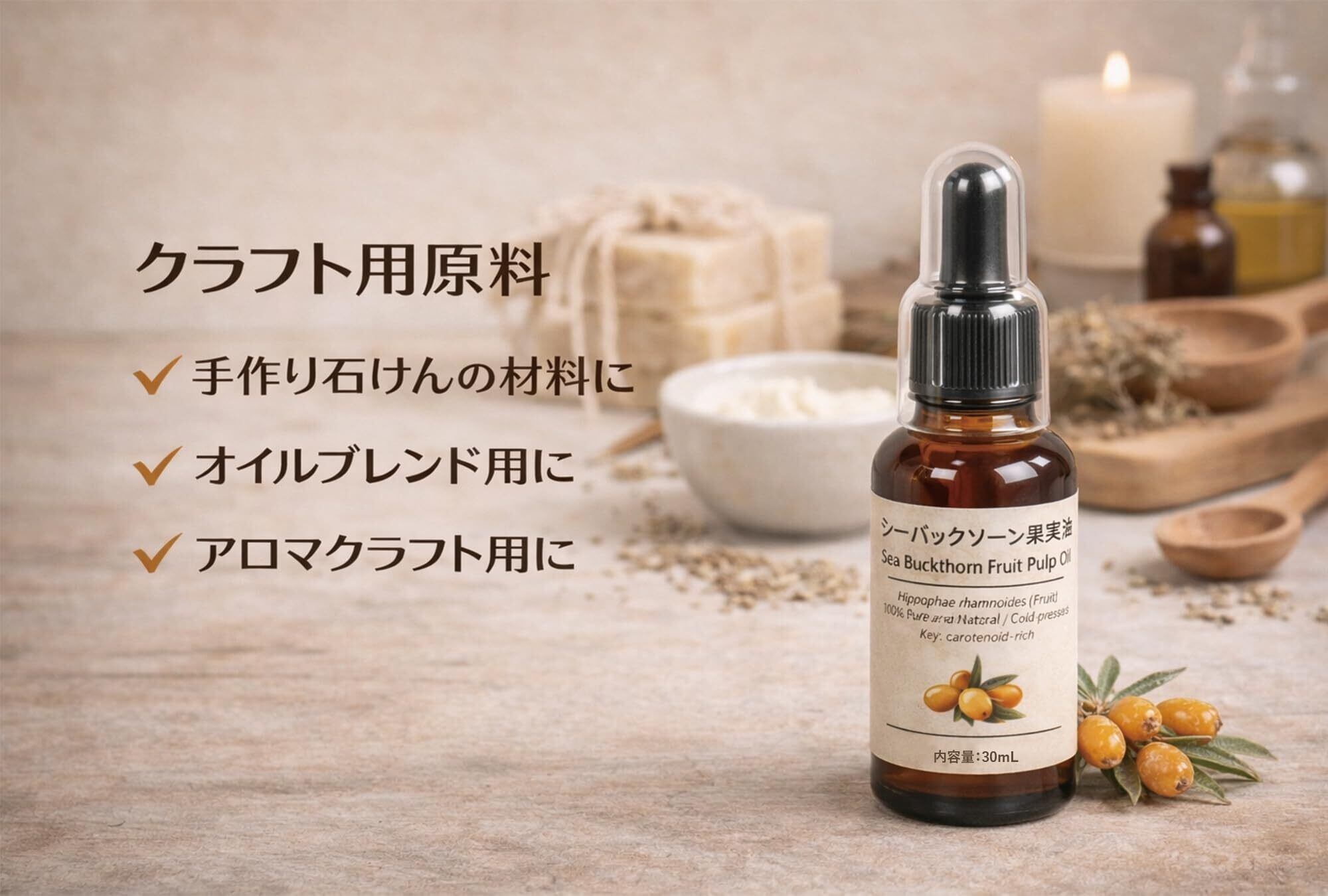 【商品概要】 RAK商店のシーバックソーン果実油 30mLです。シーバックソーン(Hippophae rhamnoides)の果実部分からコールドプレス製法で抽出した植物オイルで、種子油ではなく果実パルプ由来の Fruit Pulp Oil です。 【特長】 深みのある赤オレンジ色が特長で、石けんやバーム、オイルブレンドなどの原料素材として使いやすいオイルです。発色が強いため、少量ずつの使用やブレンド調整に向いています。 【成分(INCI/学名)】 Hippophae rhamnoides Fruit Oil ※原料情報ベースを参照しています 【製法】 コールドプレス 【内容量】 30mL(遮光ガラス+スポイト) 【外観・性状】 濃い橙〜赤橙系 果実由来の香り ※衣類・シリコン型などへの色移りにご注意ください 【用途】 手作り石けん バーム オイルブレンド クラフト原料 【ブレンド目安】 まずは他油に0.5〜3%程度から、色味や使用感を見ながら調整してください 【保存】 直射日光・高温多湿を避け、冷暗所で保管してください 【注意】 飲用不可 目や粘膜、傷のある部位への使用は避けてください 異常を感じた場合は使用を中止してください 乳幼児・ペットの手の届かない場所に保管してください