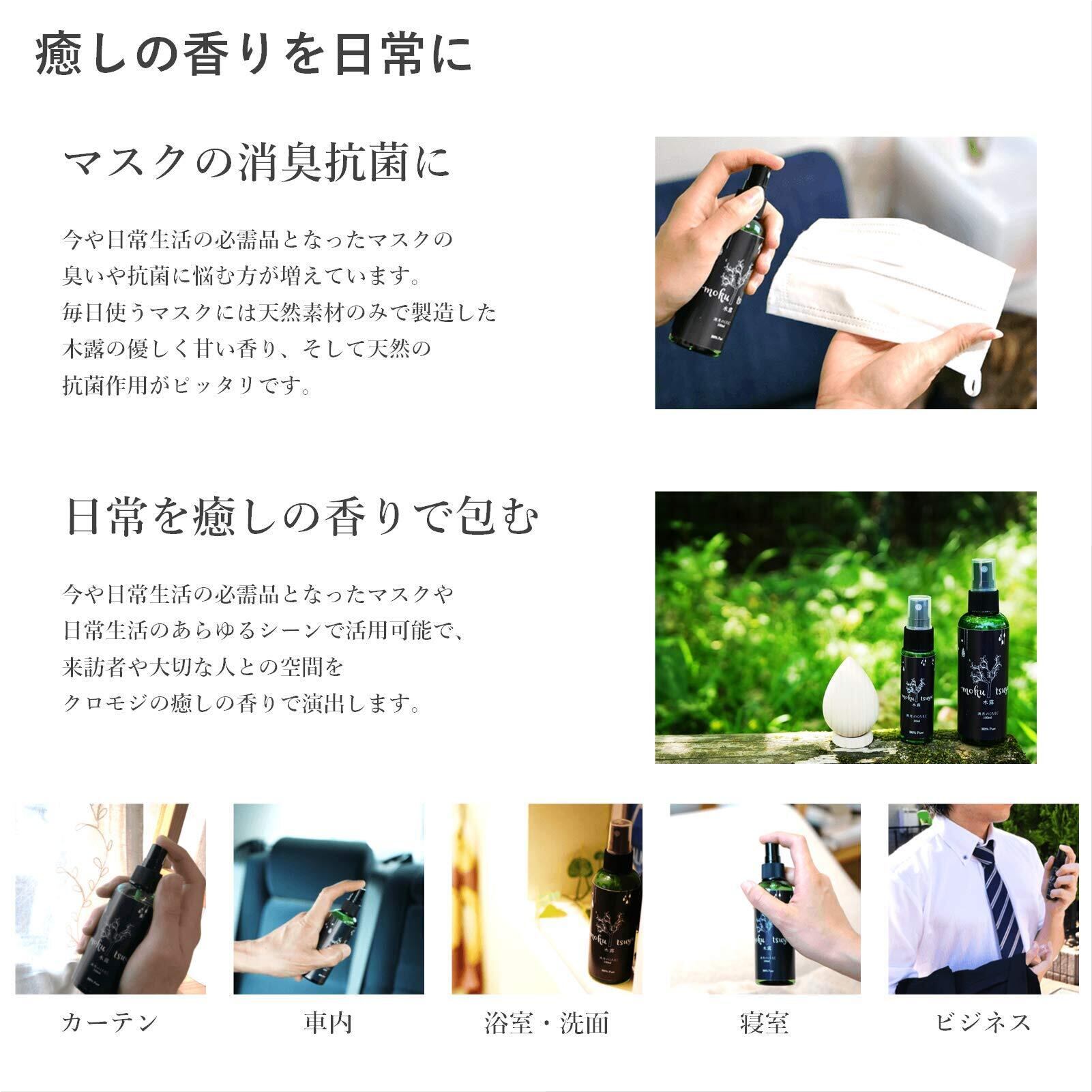 100%鳥取県大山山麓のクロモジを利用したすべて国産商品の精油から生まれたアロマウォーターです。