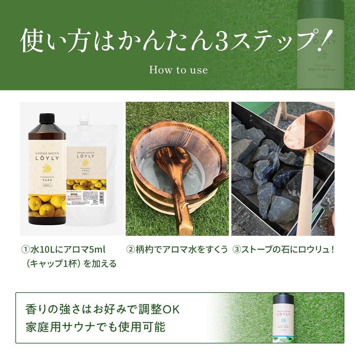 サウナで様々な香りをお楽しみ頂けるロウリュ用アロマウォーター。 お好みの香りの強さに応じて量を調節してください。