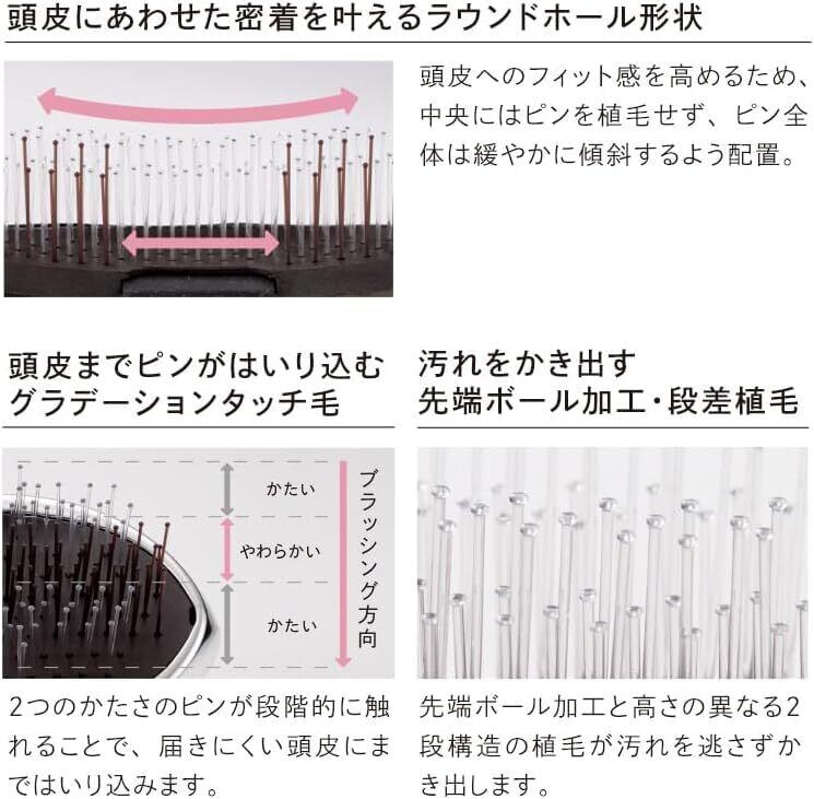 【頭皮までピンがはいり込む グラデーションタッチ毛】2つのかたさのピンが段階的に触れることで、届きにくい頭皮にまではいり込みます。